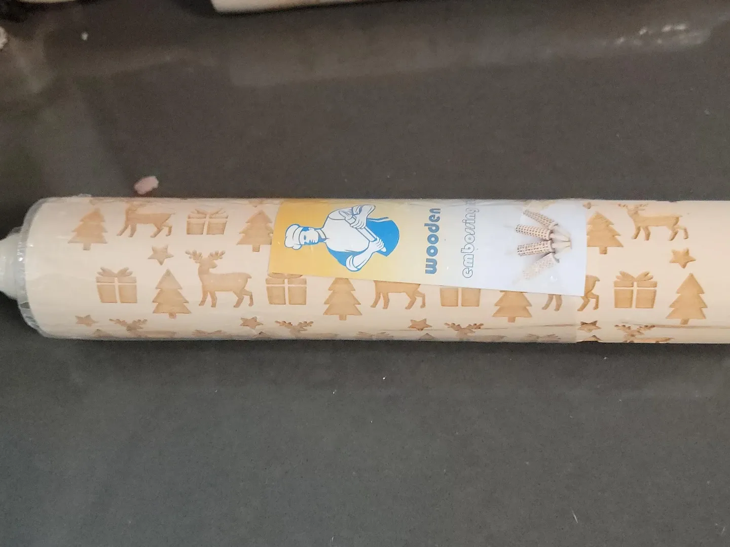I have a wooden embossing rolling pin for sale! It features a cute design with reindeers, Christmas trees, stars, and gifts. Perfect for adding a festive touch to your baking
