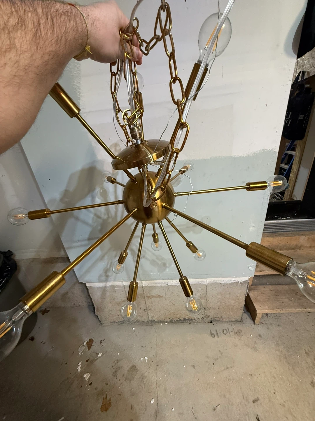 Selling a gold-coloured sputnik style chandelier. It's in great condition and would add a unique touch to any room! The chandelier features multiple arms extending from a central sphere, each holding a light bulb. Chandelier is 31x31 inches and the length with the chain is 70 inches long