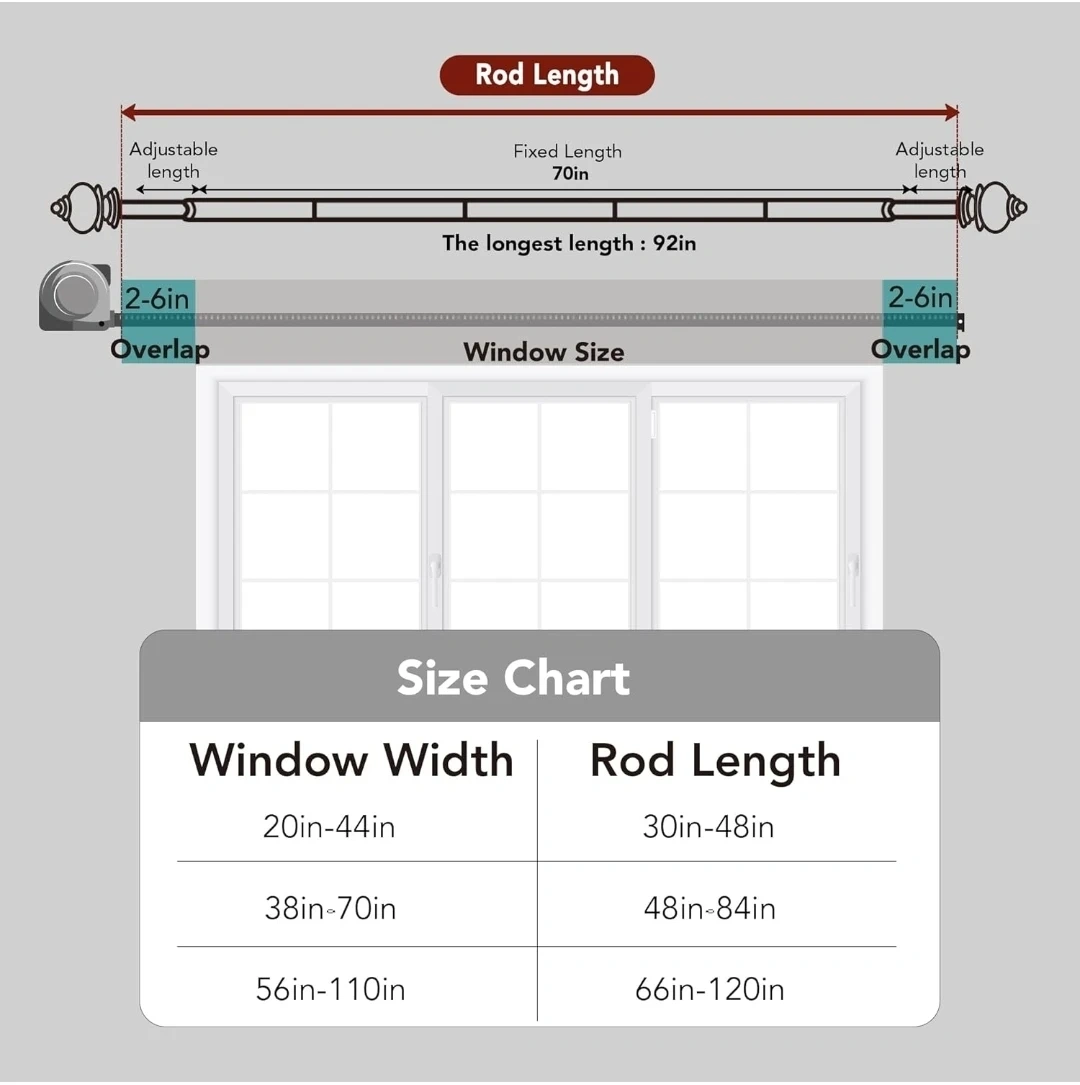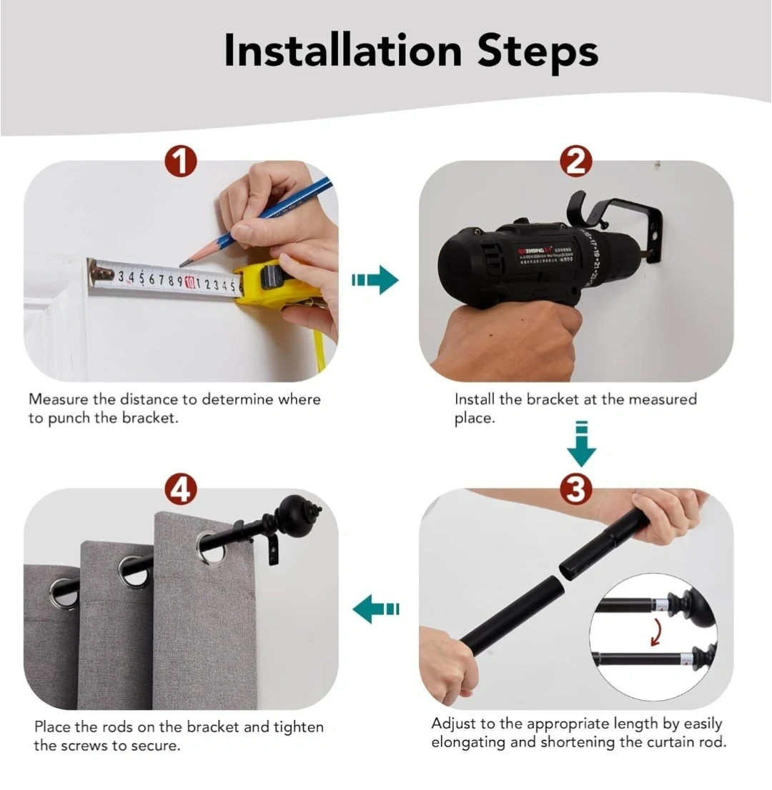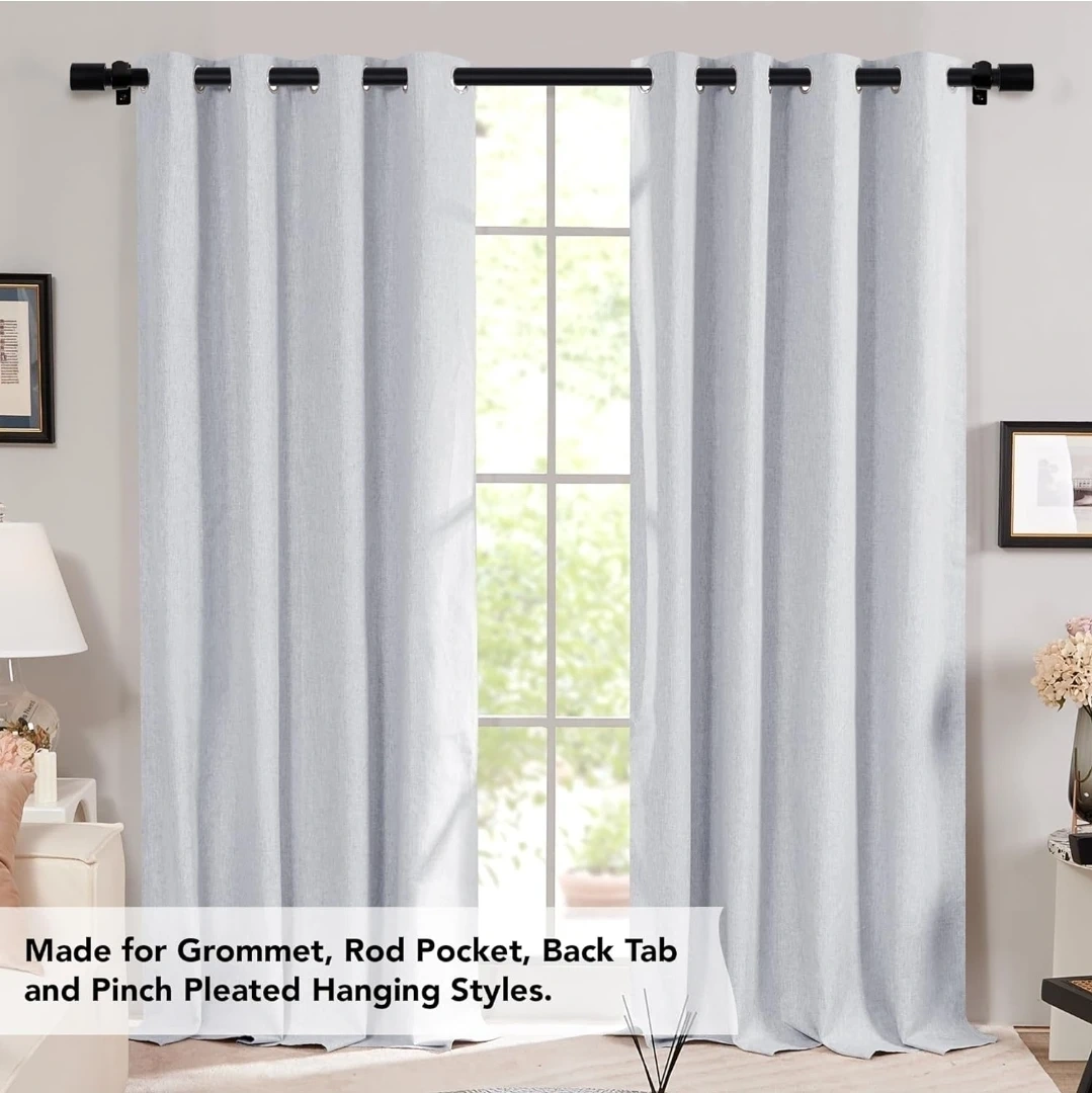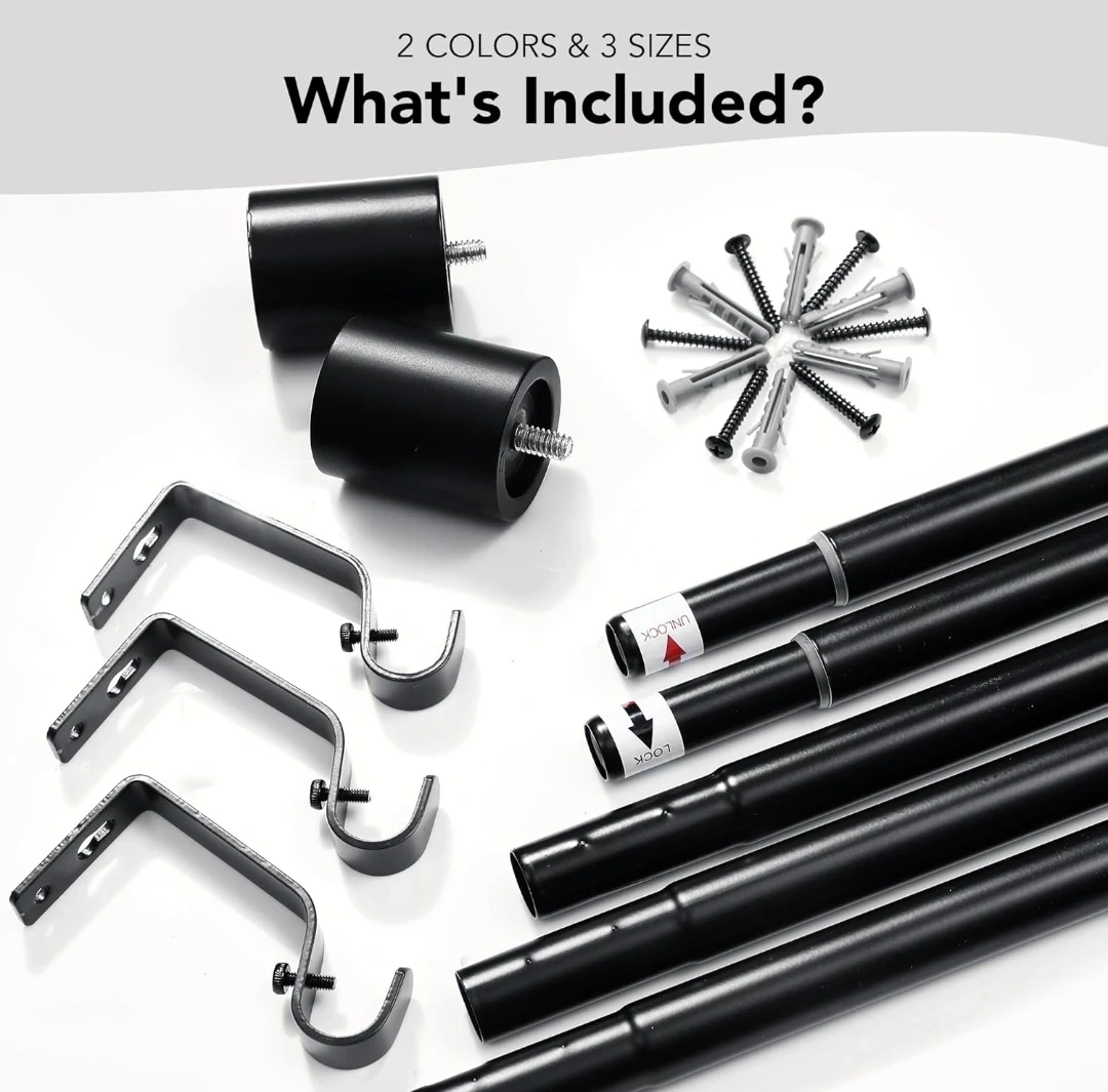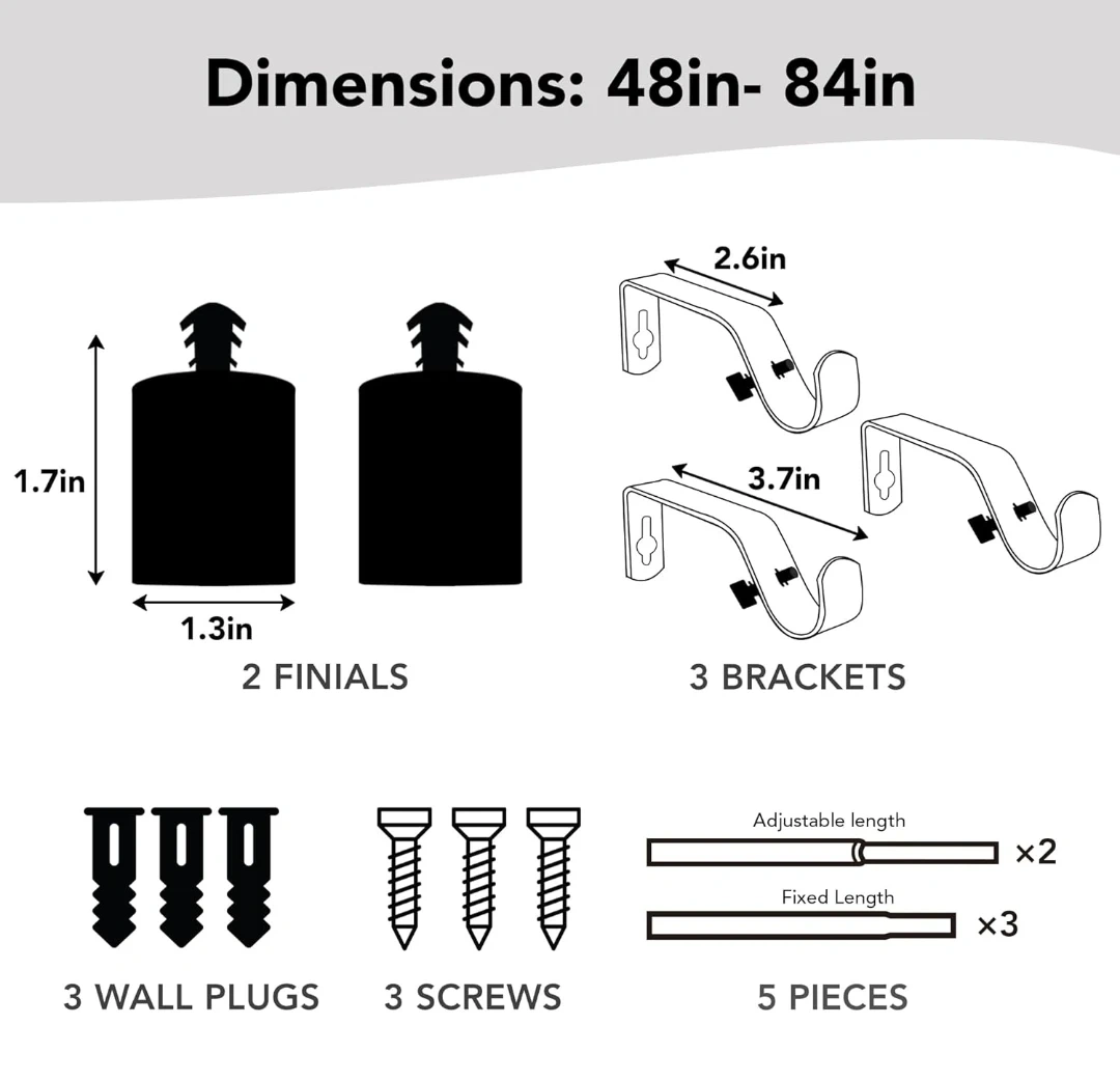 Selling a Deconovo black telescoping curtain rod, perfect for adding a touch of elegance to your living room! It can extend from 48 to 84 inches, so it's adjustable to fit different window sizes. The set includes the rod, finials, brackets, wall plugs, and screws, so you'll have everything you need for installation