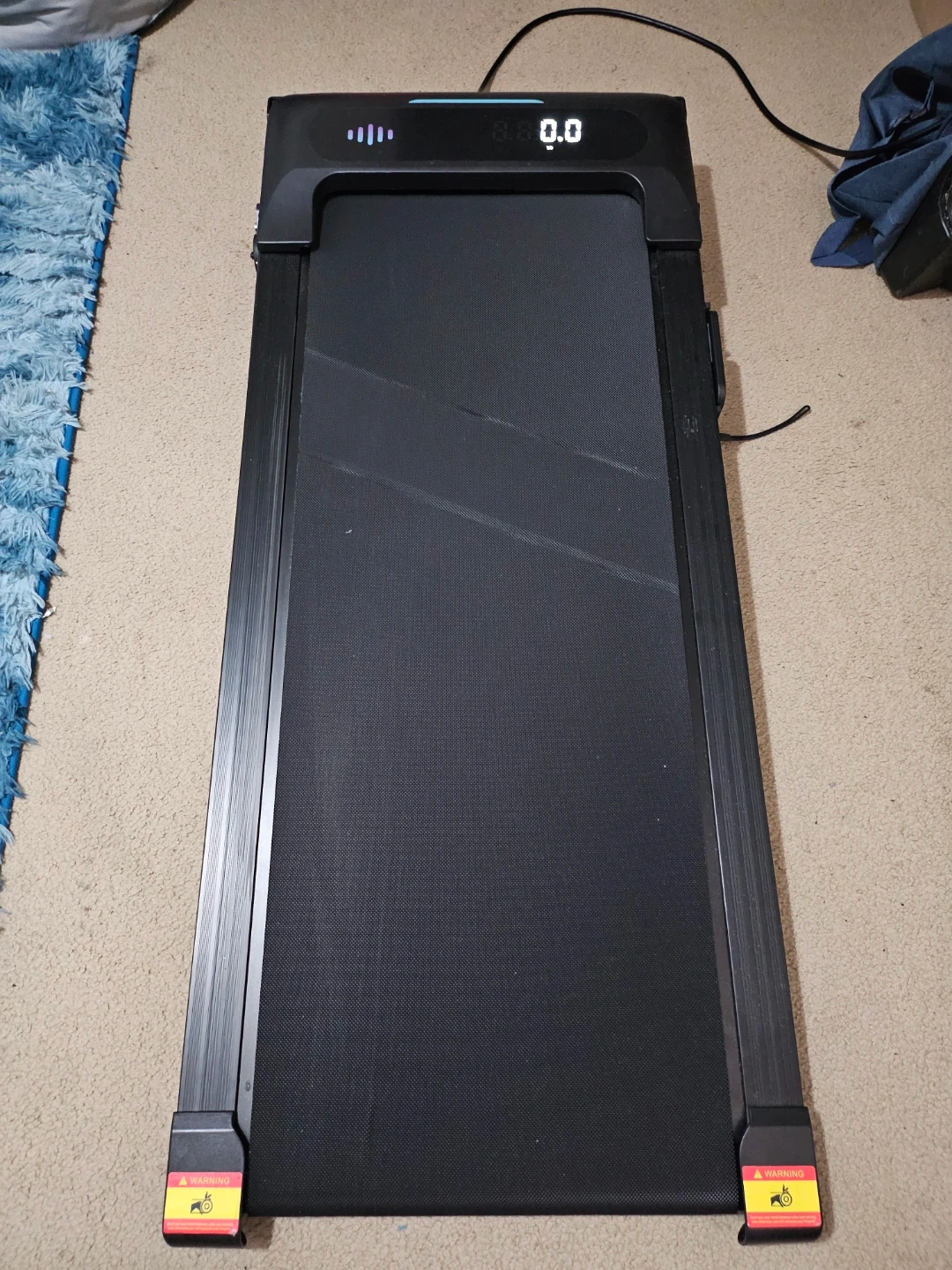 Selling an under-desk walking pad in good condition! It is a compact, motorized fitness machine designed for walking or light jogging. LED display showing metrics like speed, time, distance, and calories. Remote controlled. Message me if you're interested!
