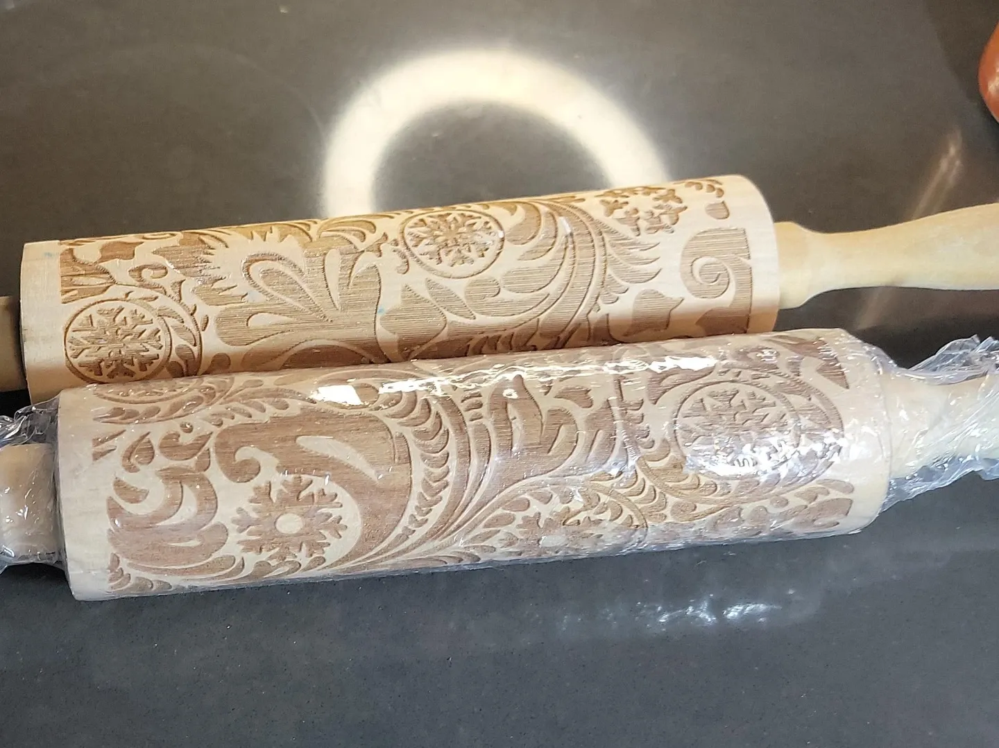 I'm selling a set of two wooden rolling pins with embossed patterns. One is still in its original plastic wrapping. They're perfect for adding a special touch to your baking!