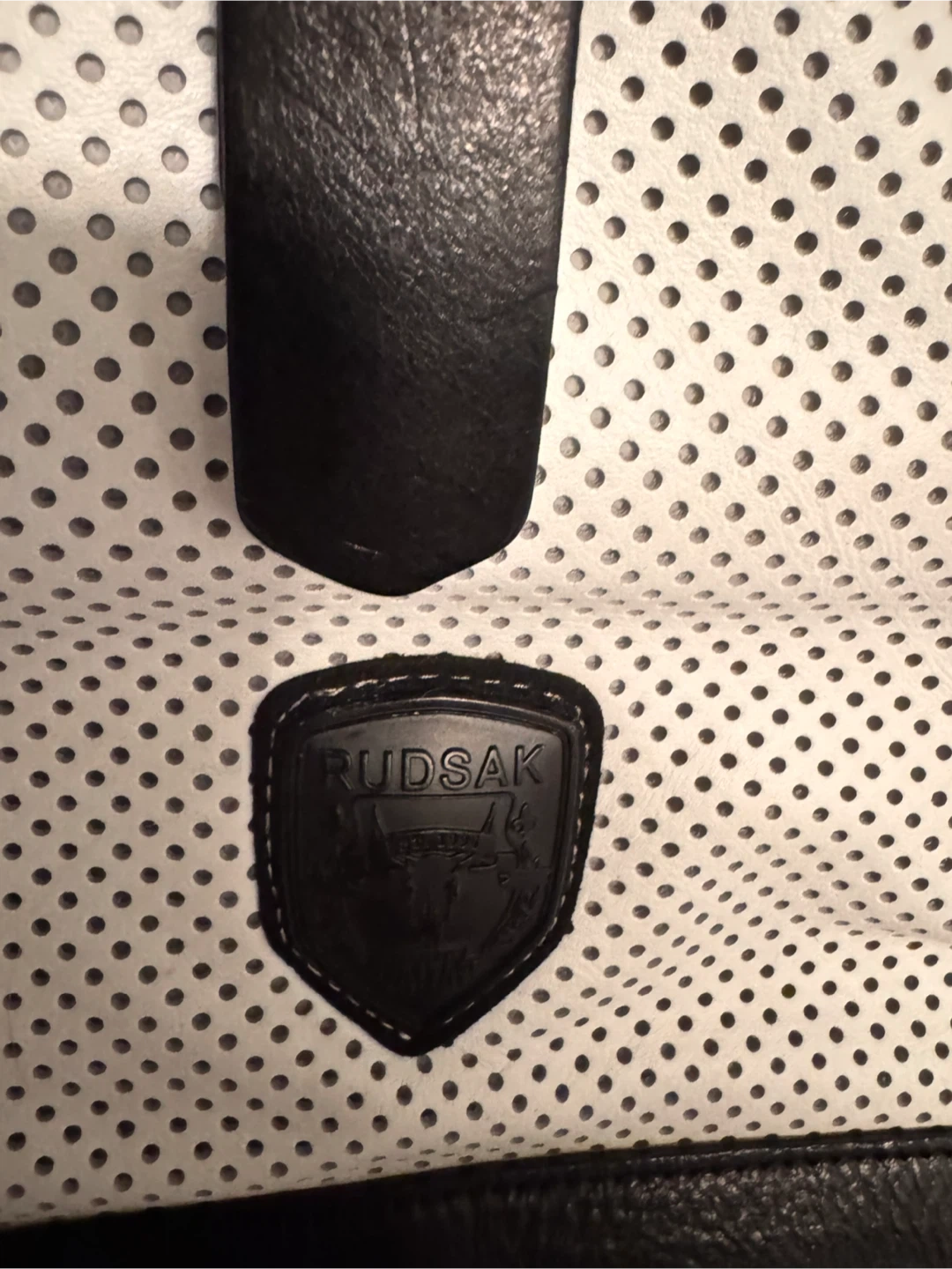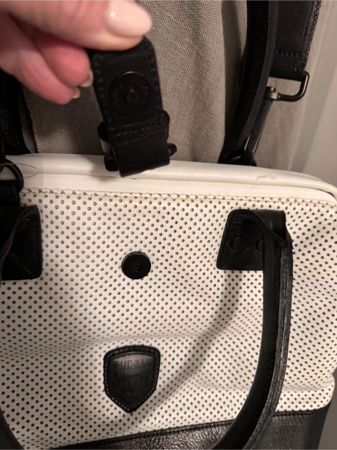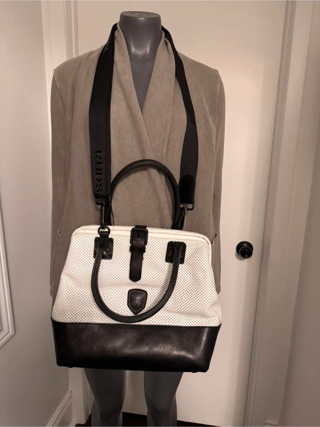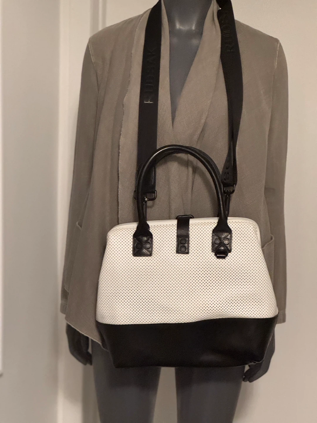 Selling a Rudsak handbag in a stylish white and black leather design! It features a perforated white upper section and a solid black base. The bag comes with a black shoulder strap with the Rudsak logo. Perfect for adding a touch of sophistication to any outfit. Never used so pristine