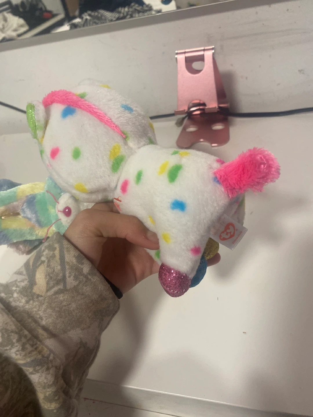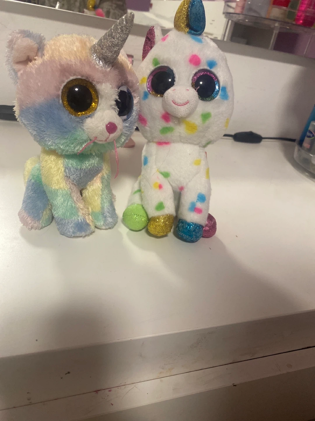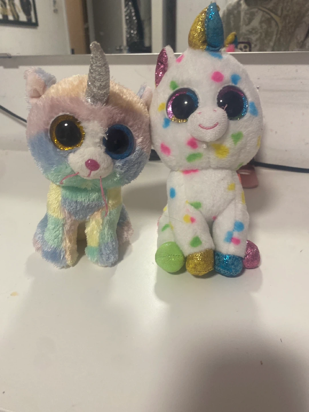Selling two adorable Ty Beanie Boos! One is Heather, a pastel rainbow unicorn cat, and the other is Confetti, a white unicorn with colourful confetti spots and a pink tail. Both are in great condition and ready for a new home