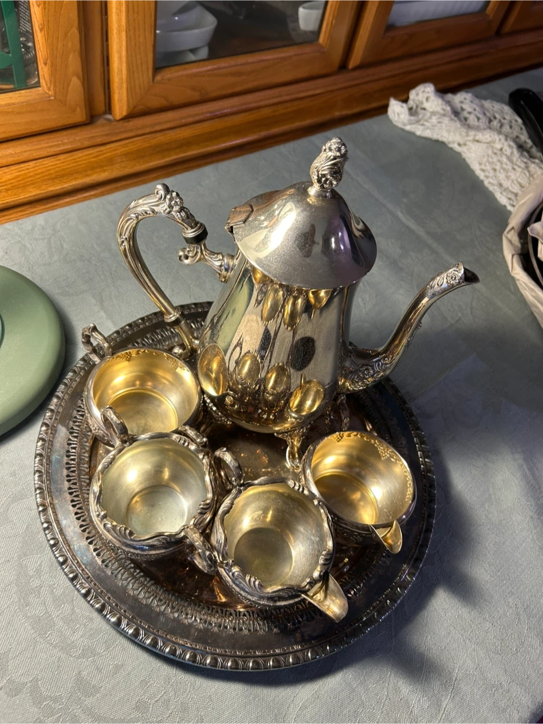 Selling a beautiful vintage silver plated tea set. It includes a teapot, four cups, and a tray. The set has intricate detailing and a classic design, perfect for adding a touch of elegance to your tea time