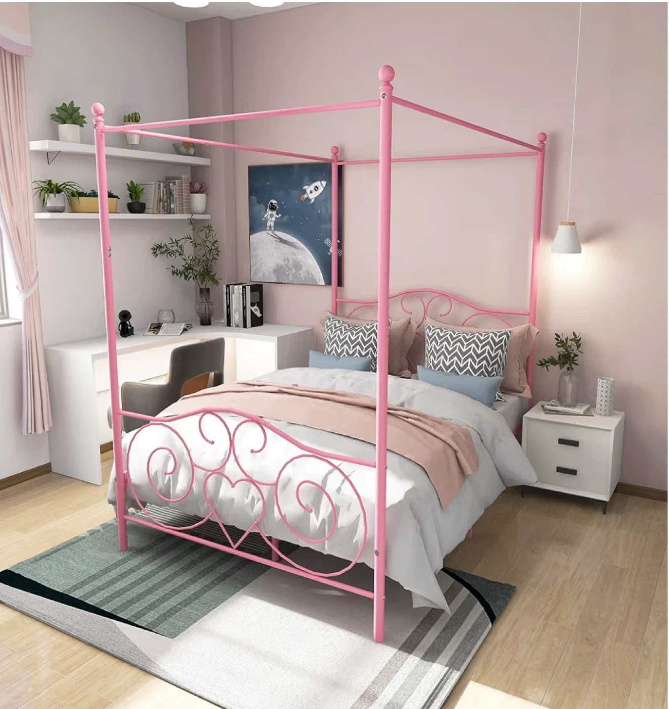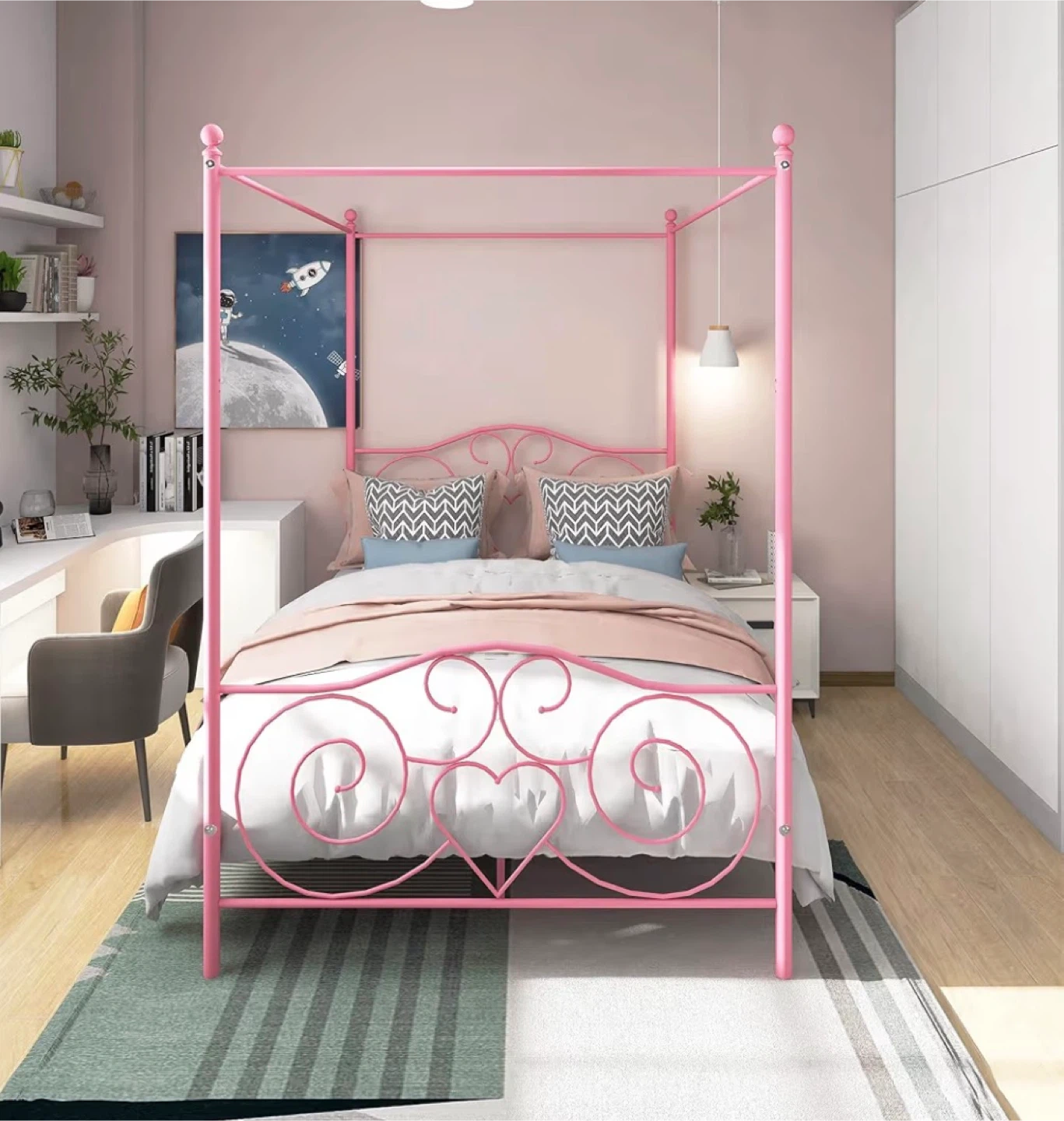 Here's a super cute pink metal canopy bed frame! It features aesthetic modelling with a heart design, Roman bedposts, metal pipes, and protective pads on the feet.