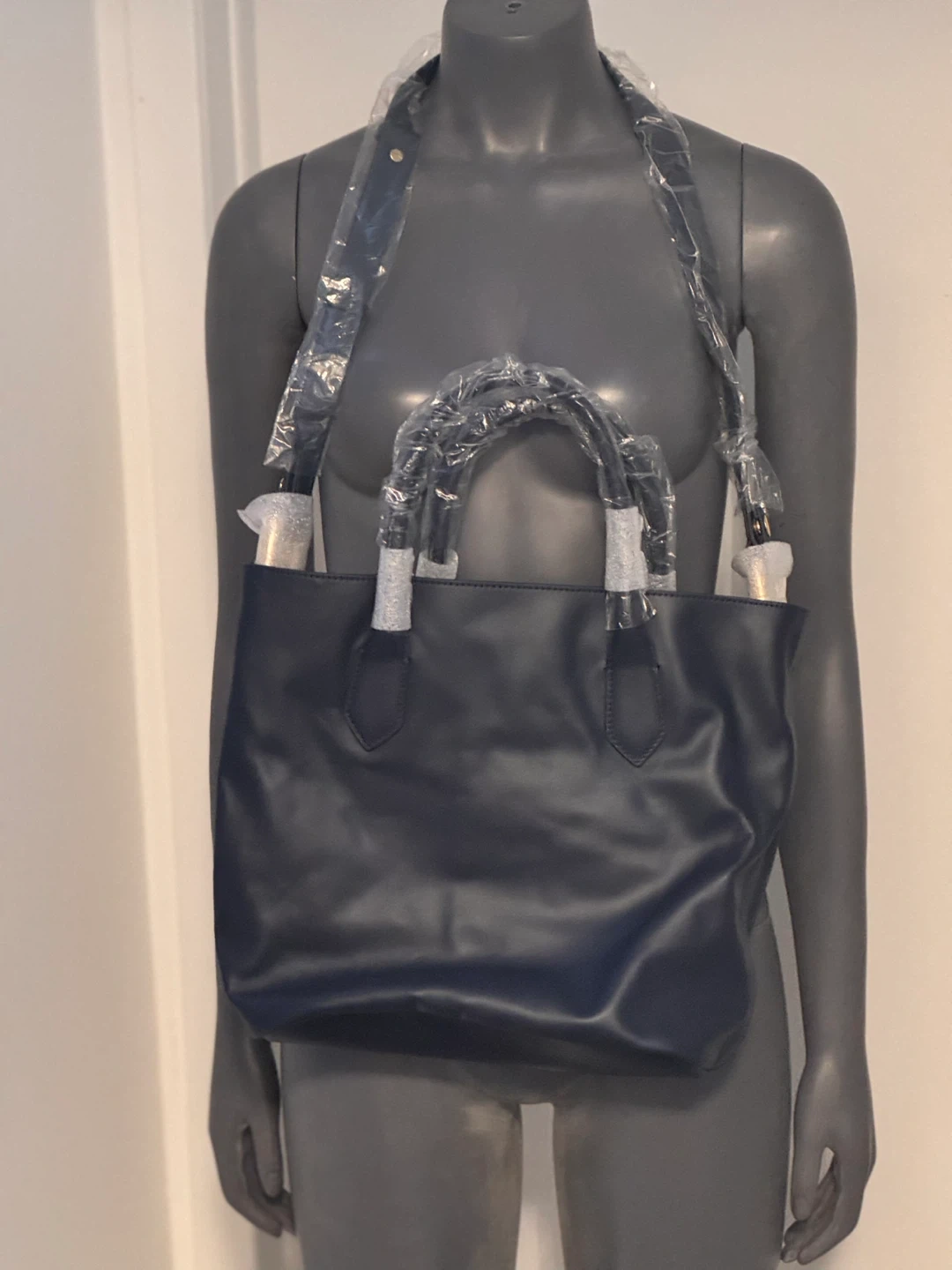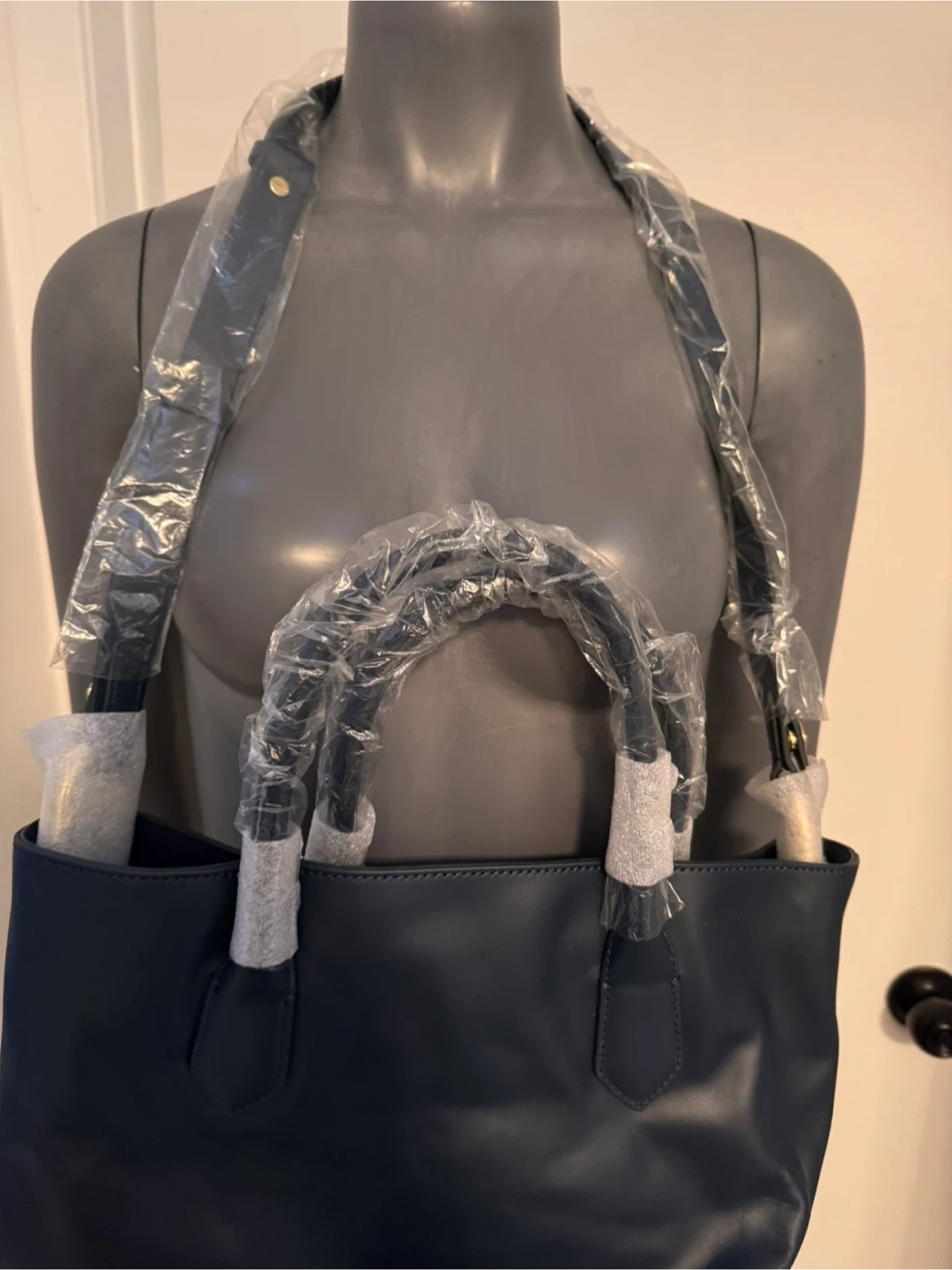 Check out this beautiful J.Crew navy blue leather tote bag! It's brand new and comes with its original packaging. Perfect for everyday use or as a stylish accessory for any outfit. The bag features a spacious interior and a detachable shoulder strap for added convenience