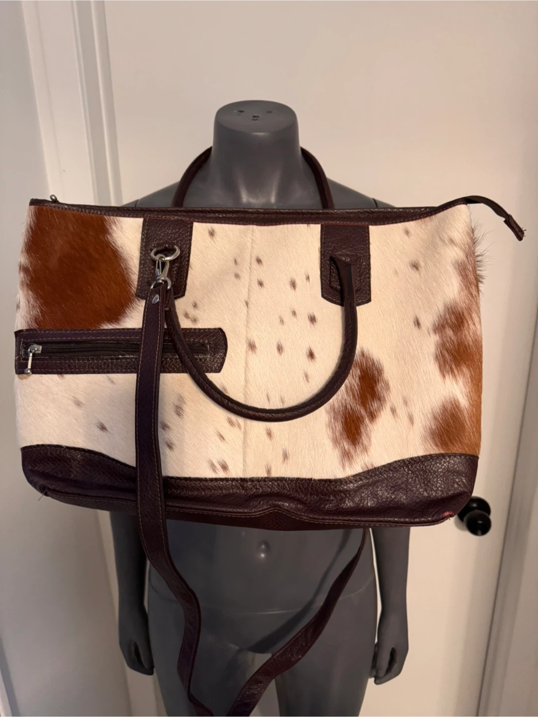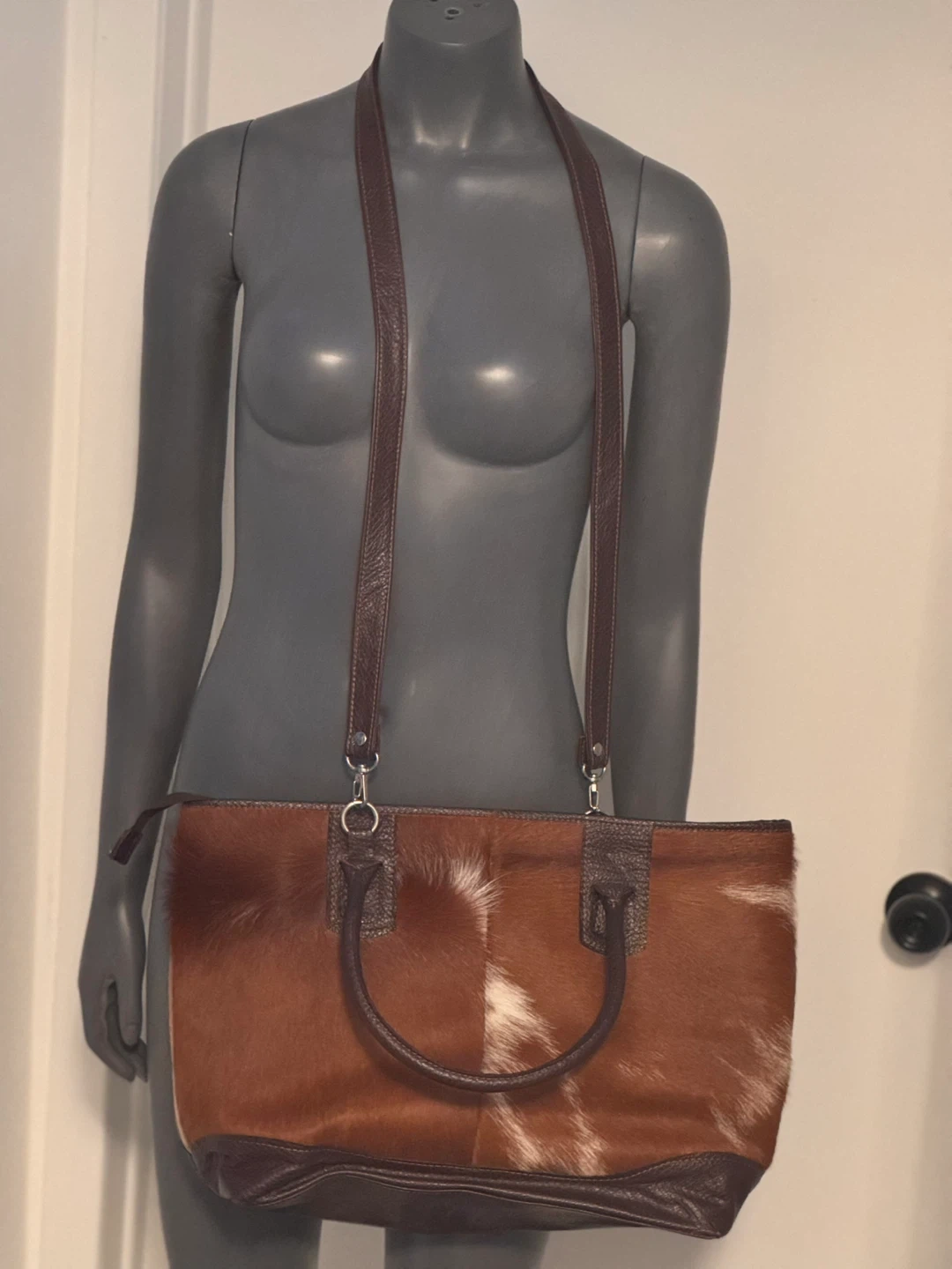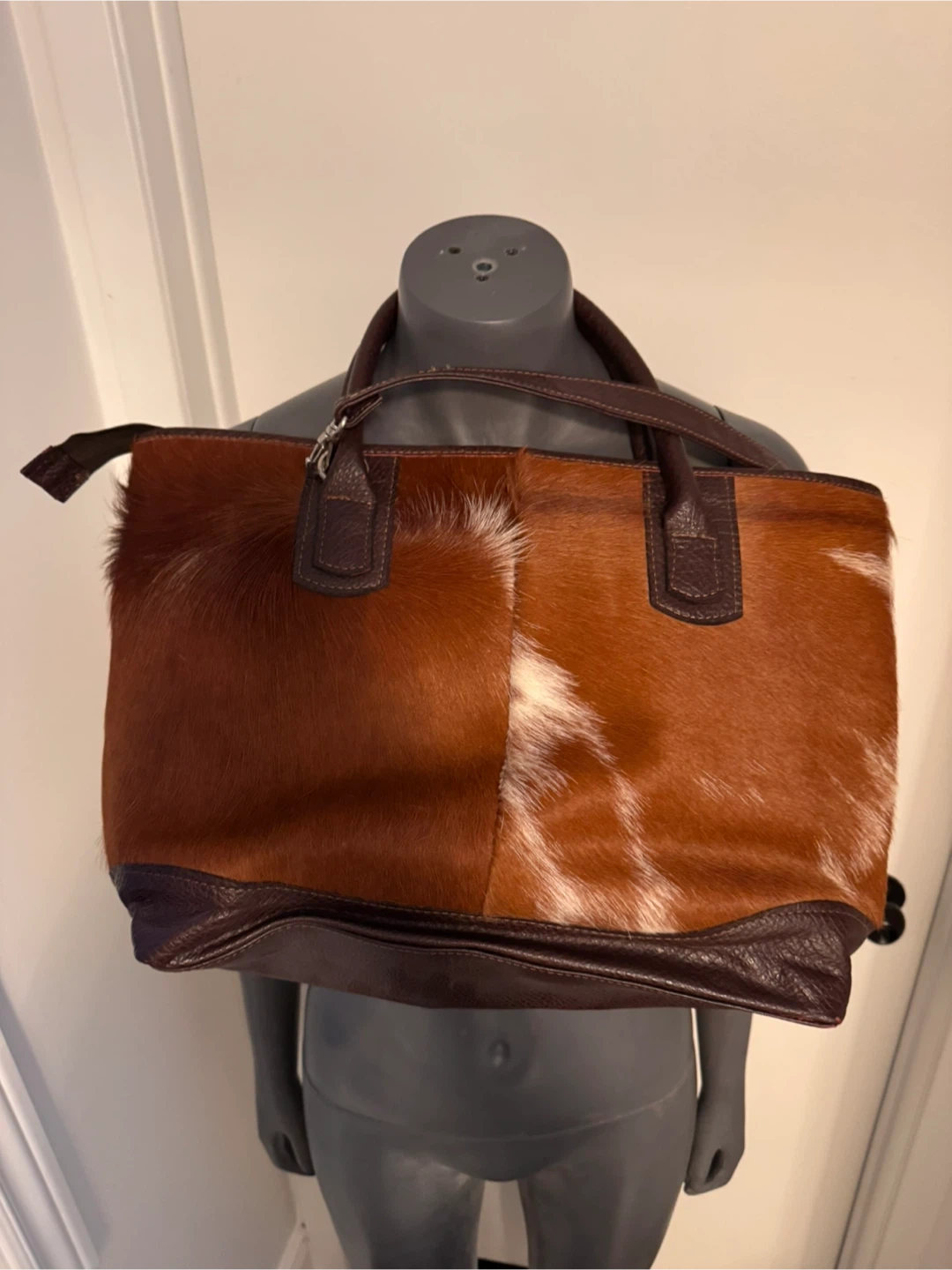 Here's a stylish tote bag featuring a unique combination of brown leather and cowhide! It has both handles and a shoulder strap for versatile carrying options. The bag is in great condition and ready for a new home