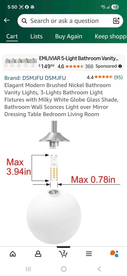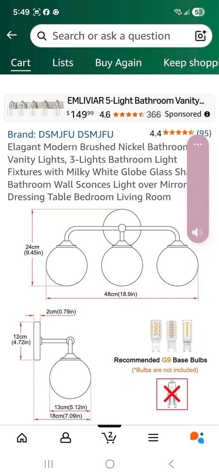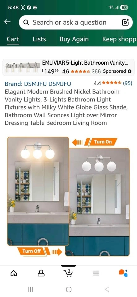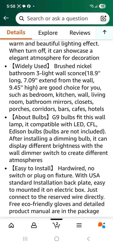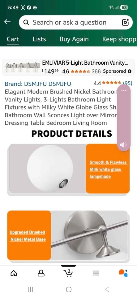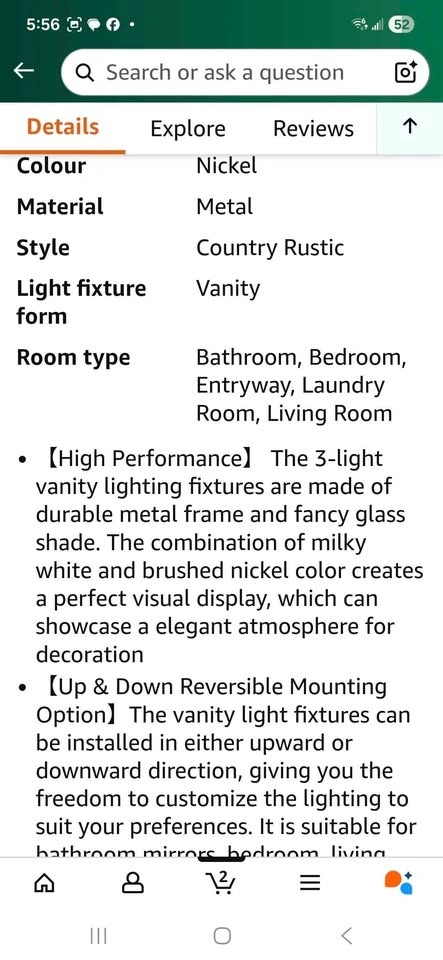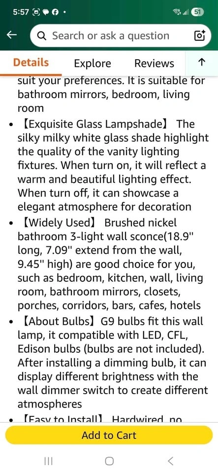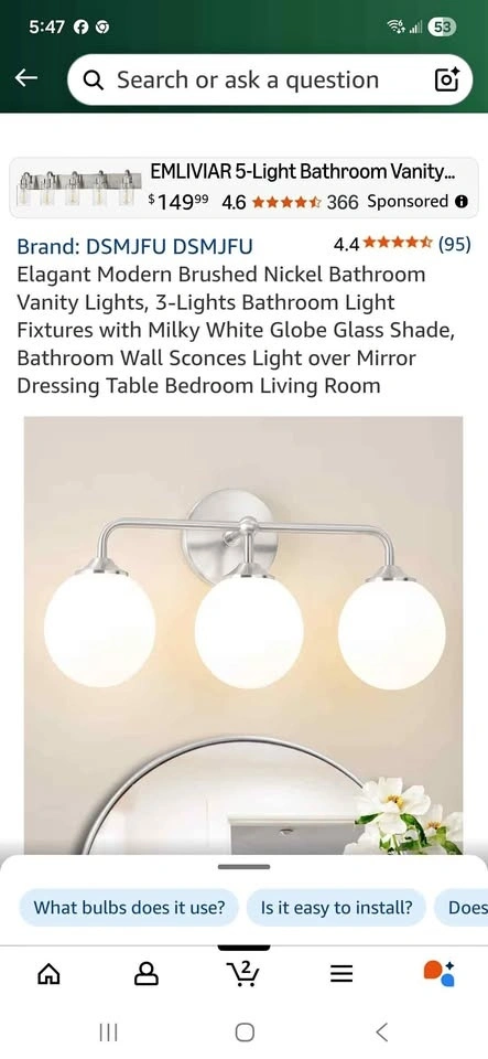 Modern brushed nickel bathroom vanity light with milky white glass shades. Has 3 lights. Upgraded brushed nickel metal base. Smooth and flawless glass. Sells on Amazon for $128.58+ tax = $145. You can buy here for less than half.