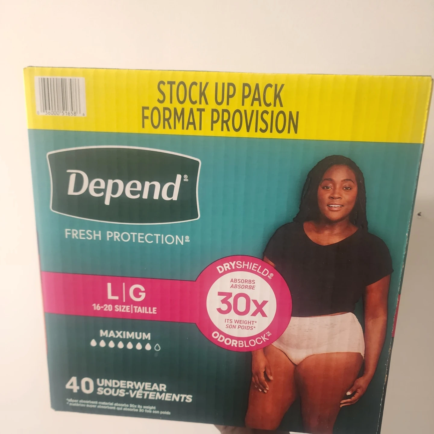 Selling a pack of Depend Fresh Protection underwear in size Large/Grande (16-20). This is a 'Stock Up Pack' with 40 underwear. They feature Dryshield technology for maximum absorbency and Odorblock protection. Perfect for fresh protection and comfort