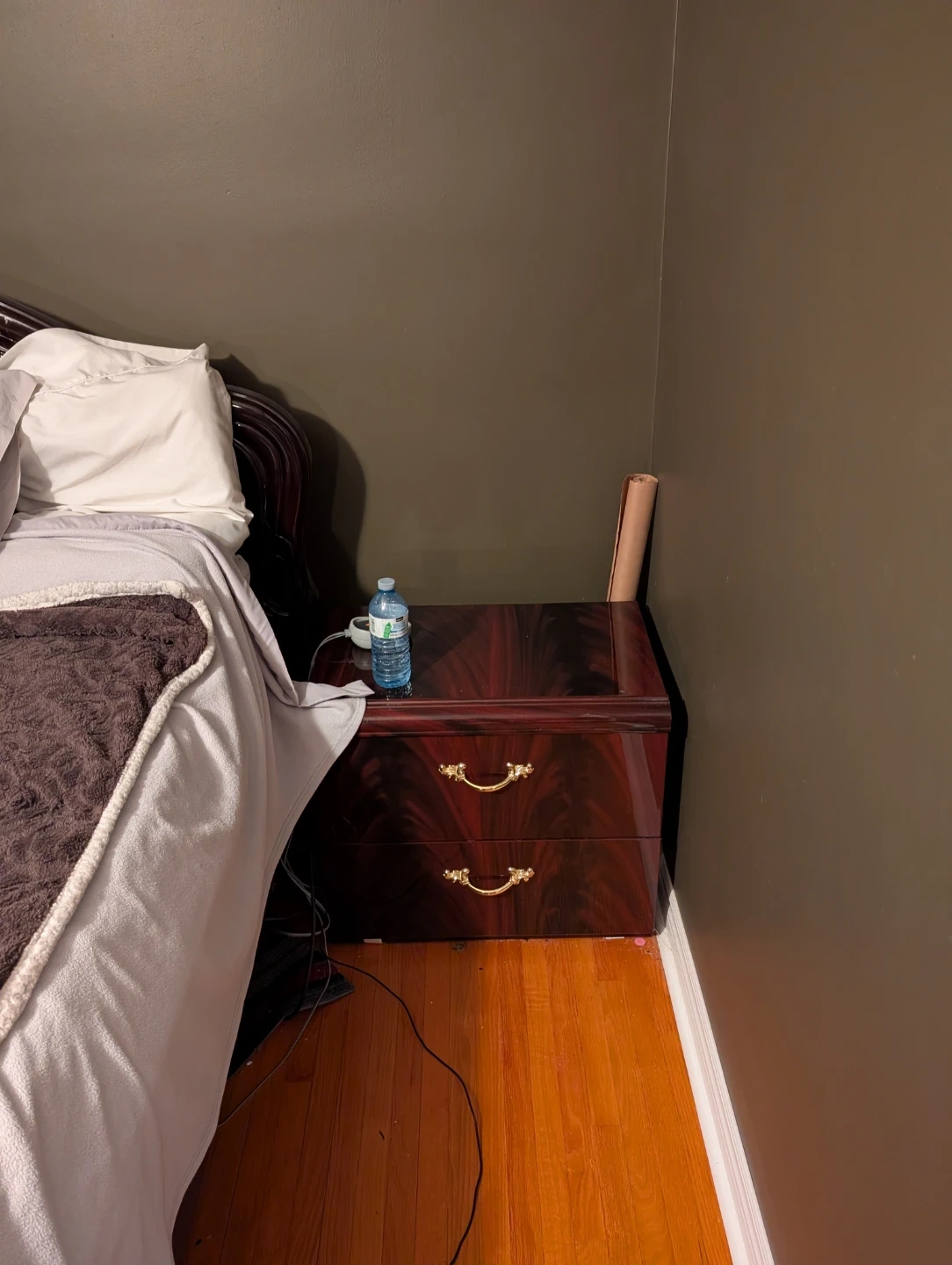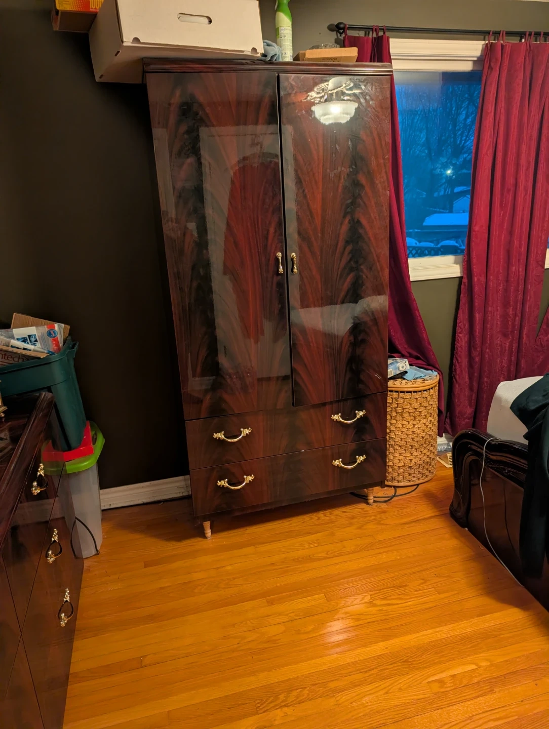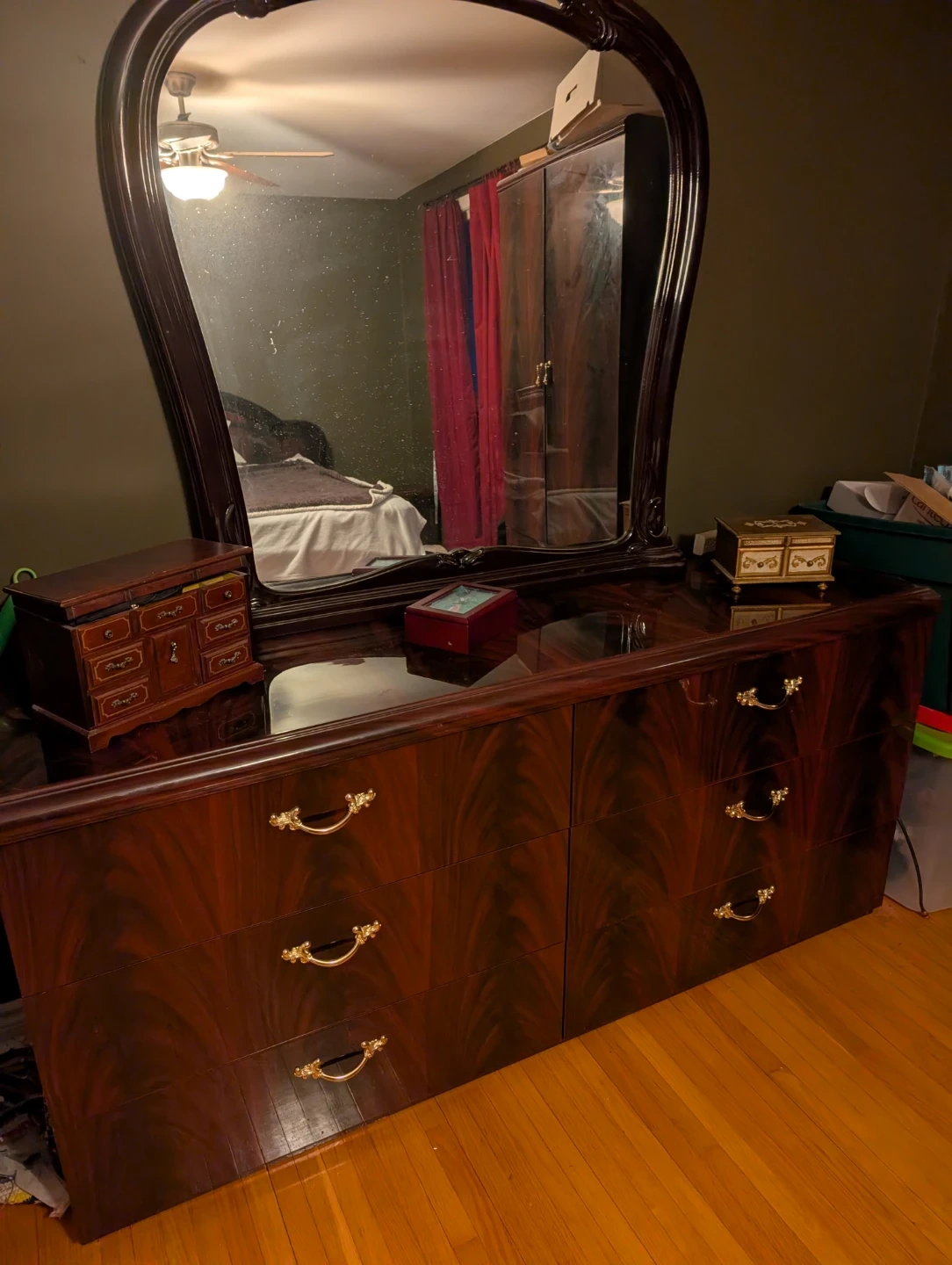 Selling a beautiful bedroom set! Includes a bed, dresser with mirror, two nightstands, and a wardrobe. The set features a rich, cherry wood finish with elegant gold-tone hardware. Perfect for adding a touch of classic style to your bedroom. Goes as a set please. Pickup only