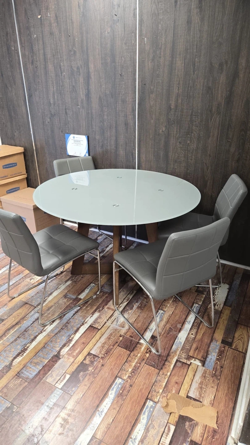 Selling a round glass dining table that comes with four stylish grey chairs. This set would look great in any dining room or kitchen space! The chairs have a modern design with a quilted pattern on the seats and backs. The table has a sturdy wooden base, and the glass top is easy to clean. It's perfect for small gatherings or family meals