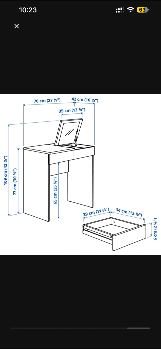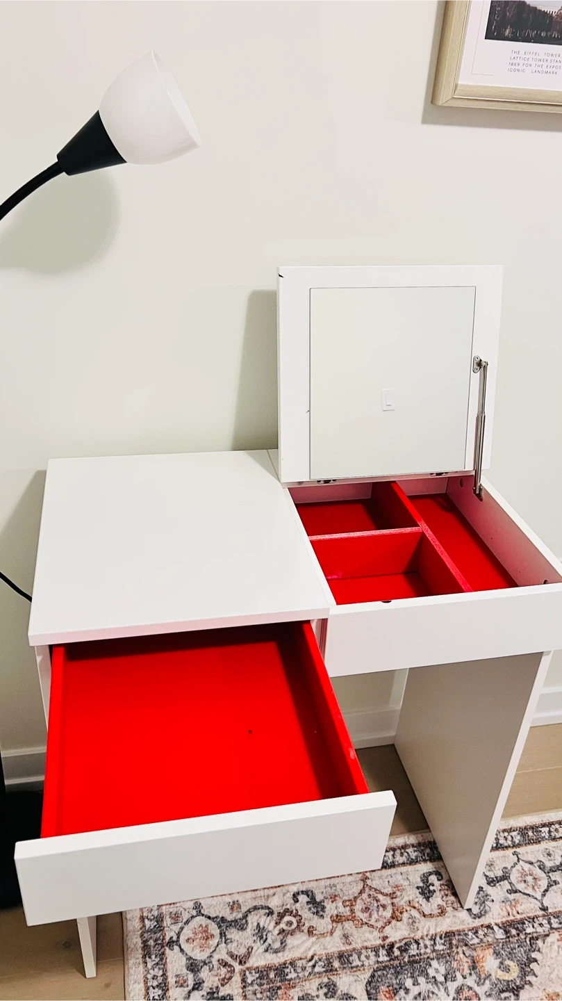 Selling a lovely white IKEA dressing table with a built-in mirror. The inside of the drawer is red. The dimensions are approximately 70 cm (27 1/2") wide, 42 cm (16 1/2") deep, and 109 cm (42 7/8") high.