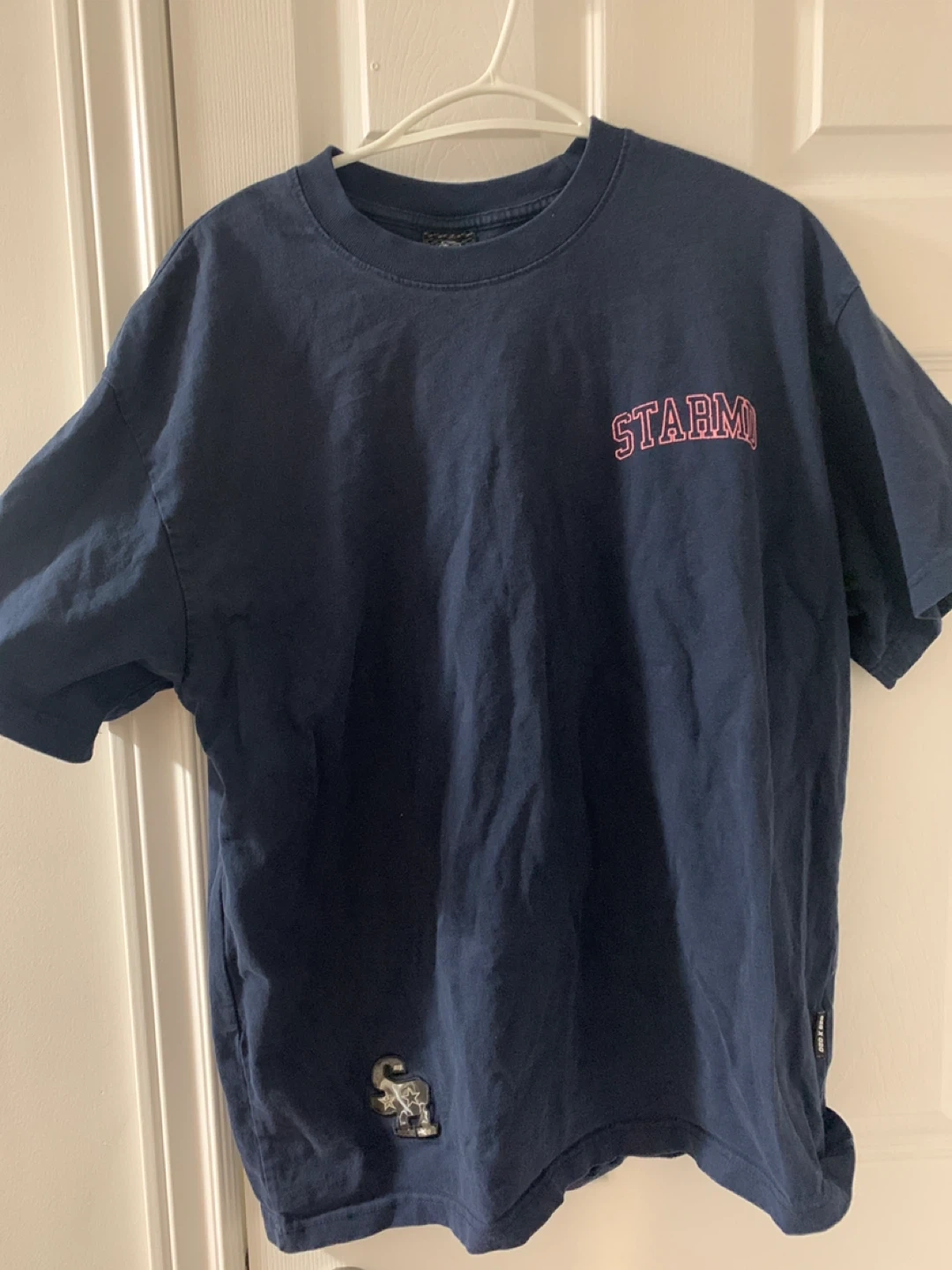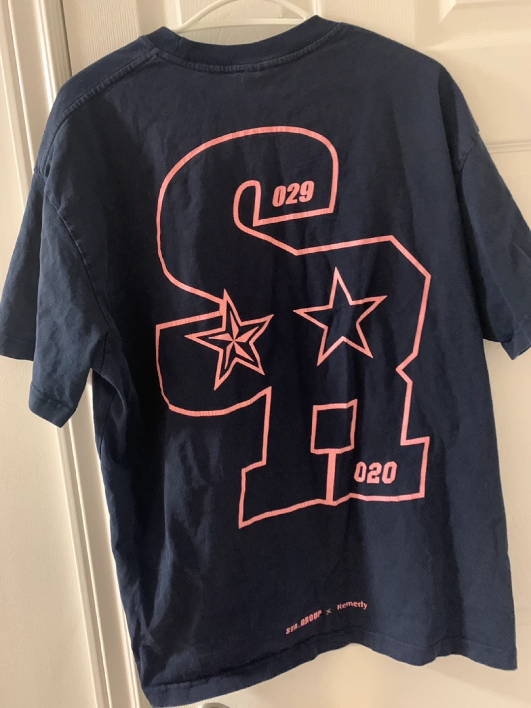 Selling a STARMA T-shirt in navy blue. The shirt features a pink design on the back with '029', two stars, '020', and 'STA.GROUP x Remedy' printed below. The front has 'STARMA' printed in pink as well