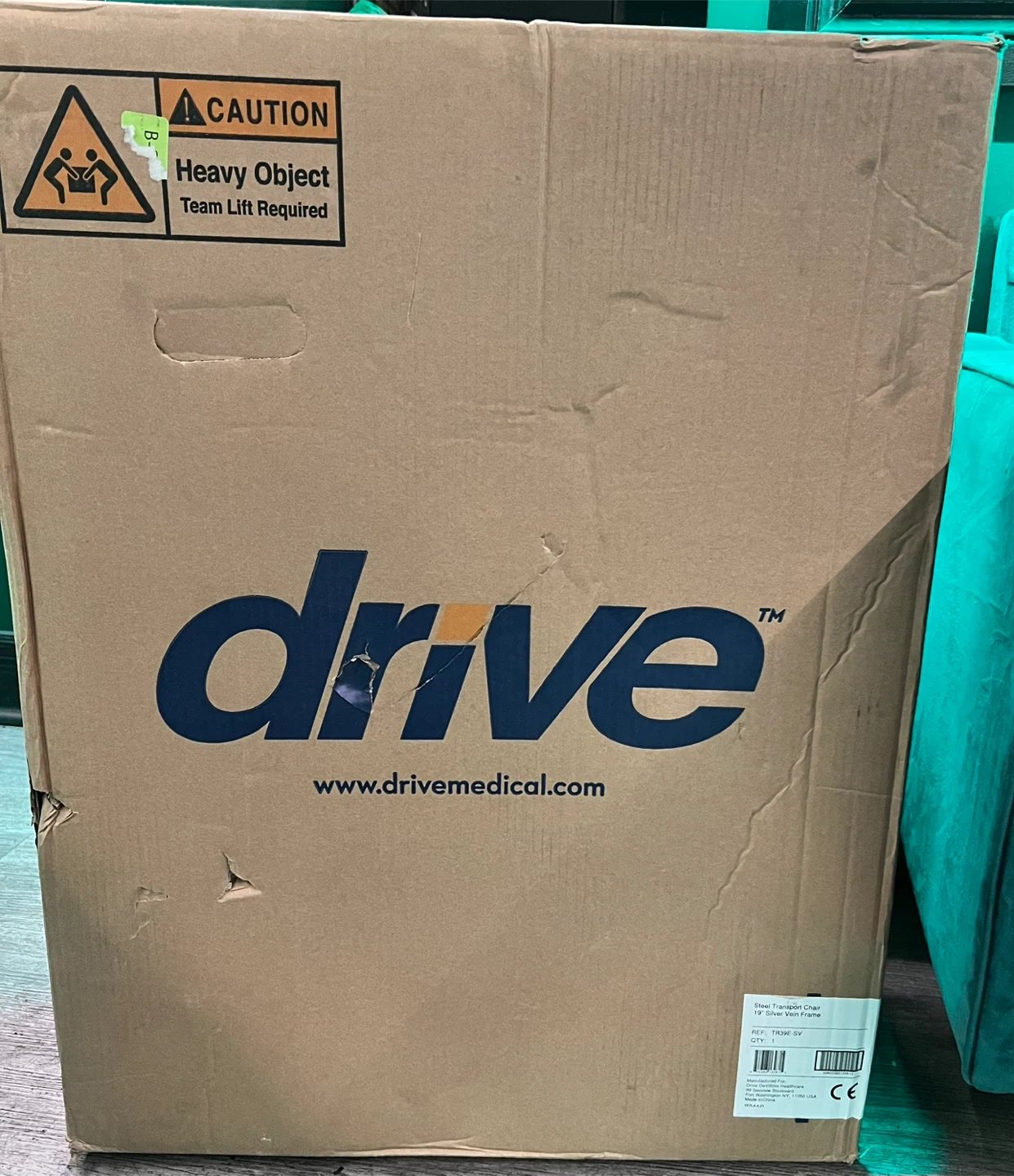 Brand new, factory-sealed Drive Medical steel transport wheelchair. Never opened or used.