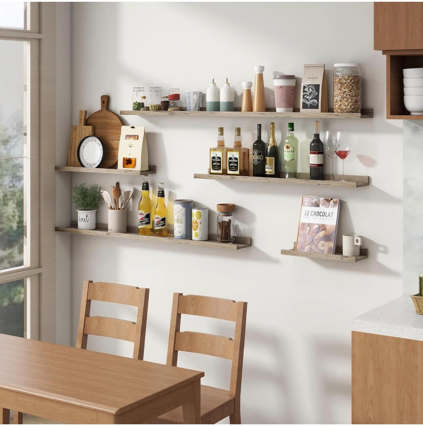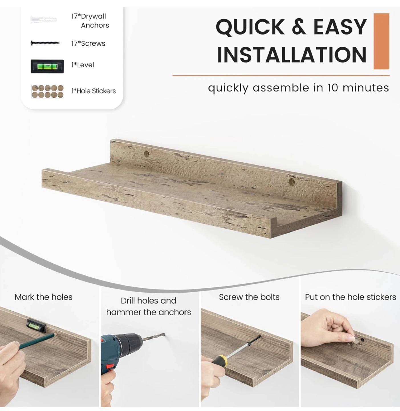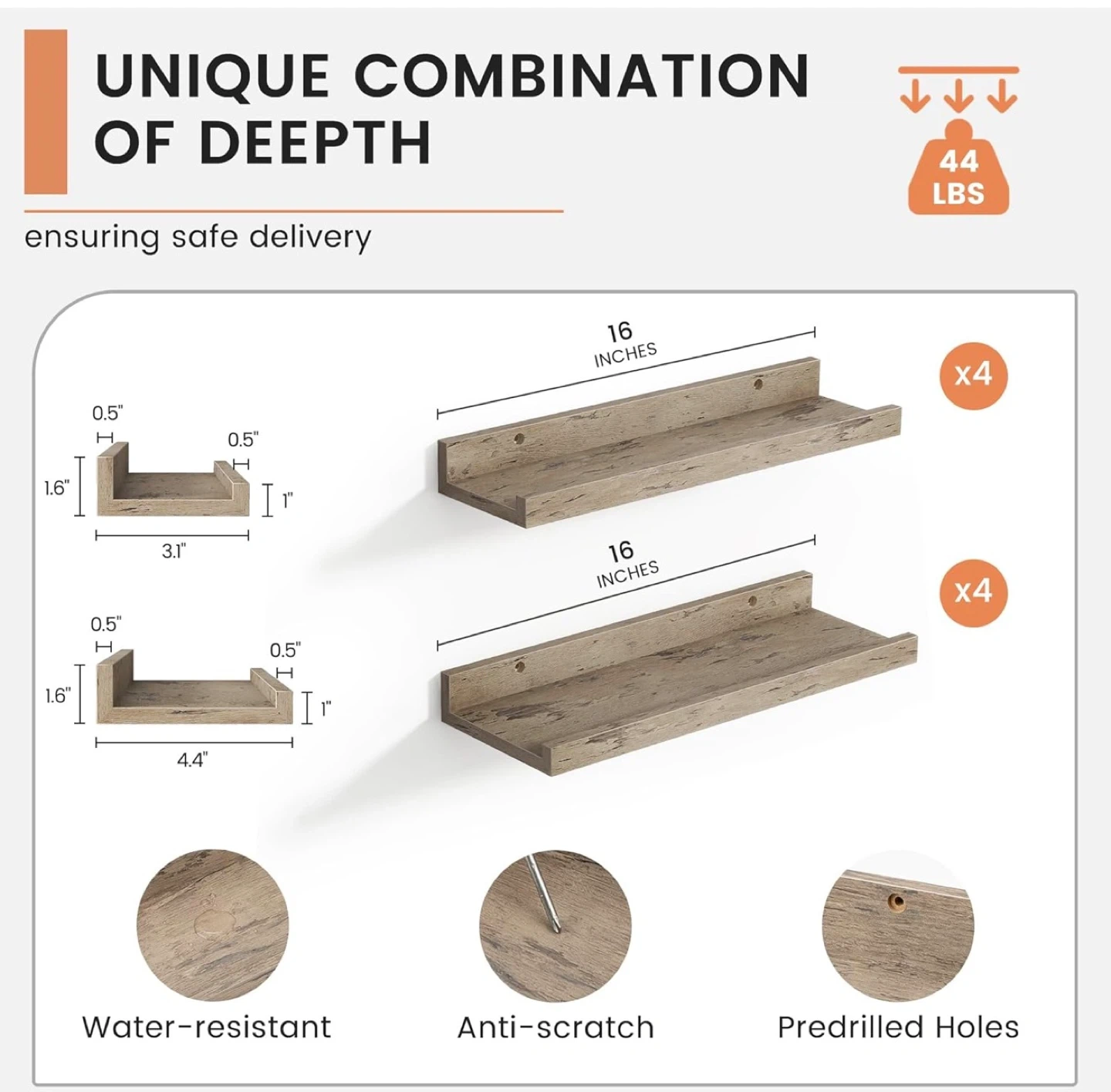 Looking to add some stylish storage to your walls? I have a set of 8 floating shelves, each 16 inches long. The wood grain finish gives them a nice, natural look. They're water-resistant and anti-scratch, so they'll stay looking great. Easy to install with predrilled holes, and they even come with hole stickers to hide the screws!