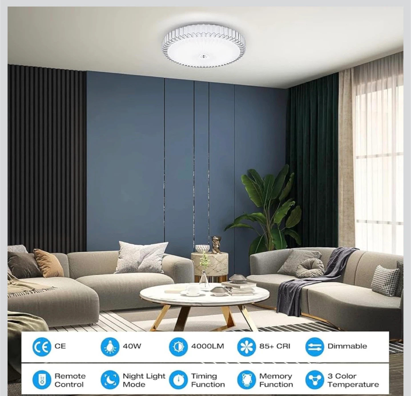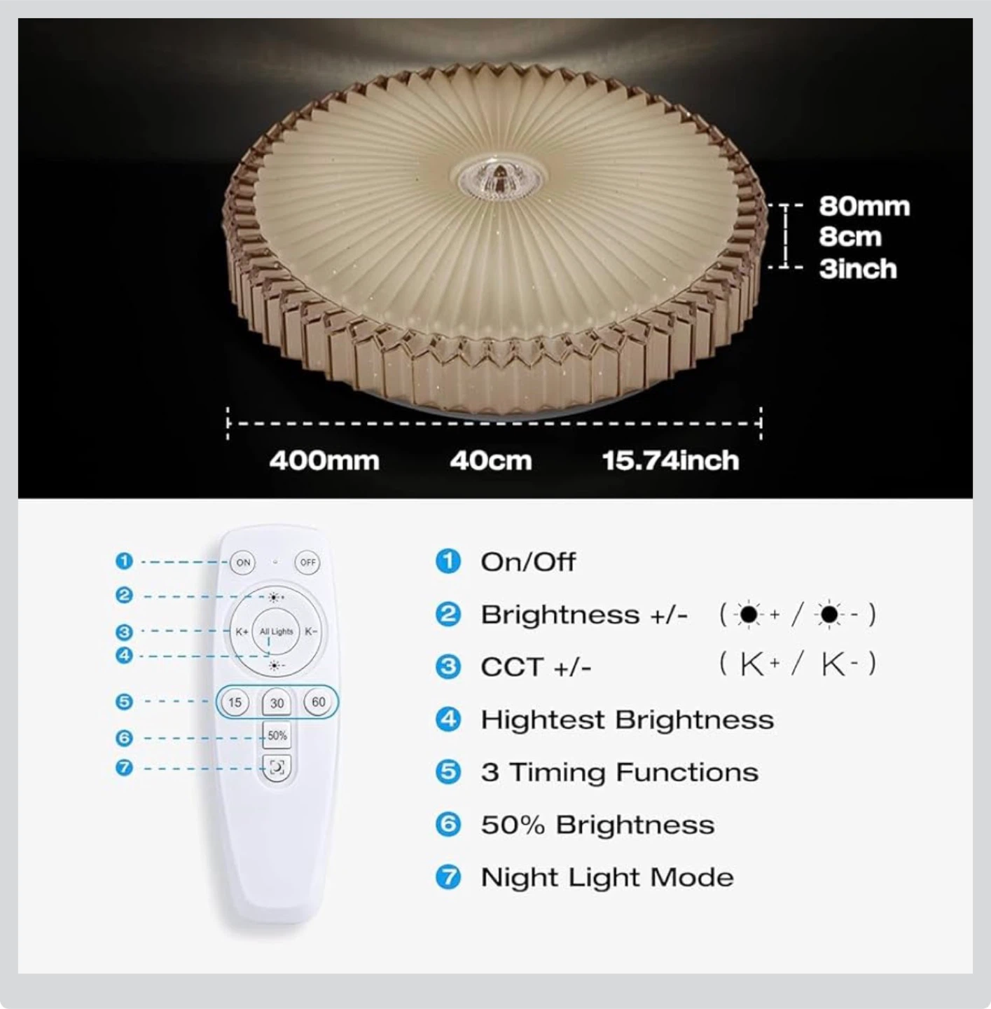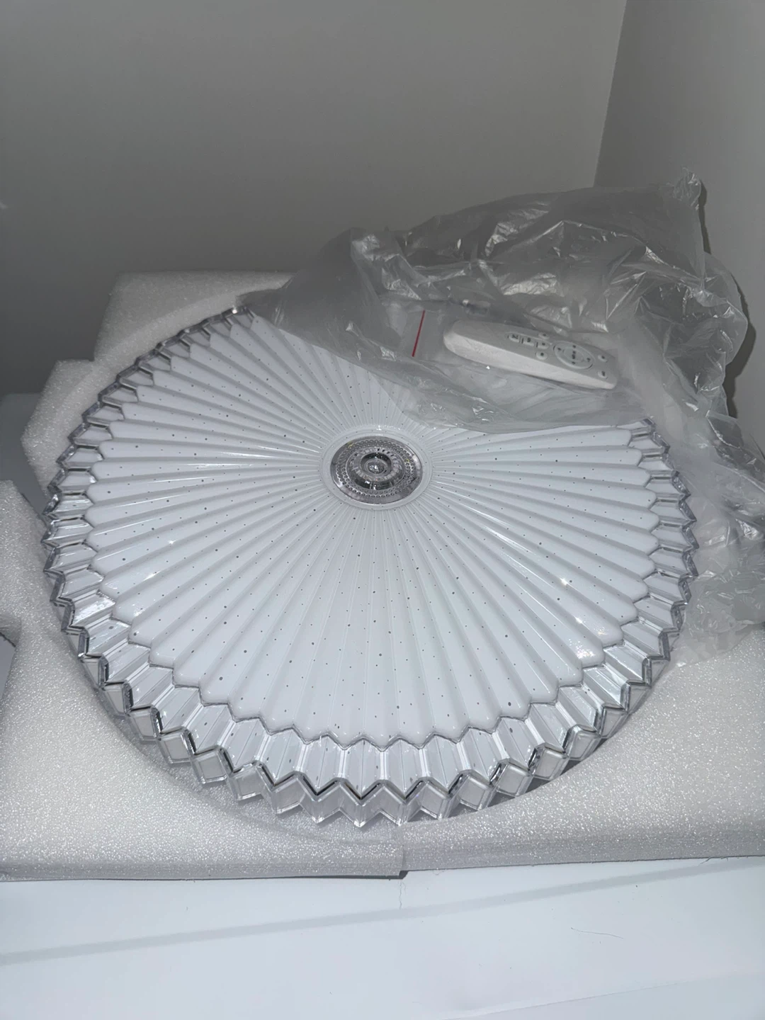 Looking to brighten up your space? I'm selling an LED ceiling light that comes with a remote control! It's dimmable and offers adjustable brightness and colour temperature (CCT). Features include a night light mode, timing functions, and a memory function. It's 40cm (15.74 inches) in diameter and 8cm (3 inches) thick.