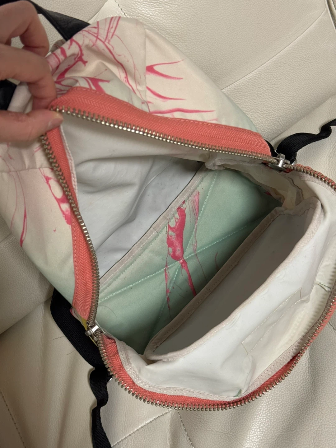 Looking to sell this gently used Marc by Marc Jacobs backpack! It features a unique pink and green marble pattern with blue zippered pockets on the front. Perfect for adding a pop of colour to your everyday look!