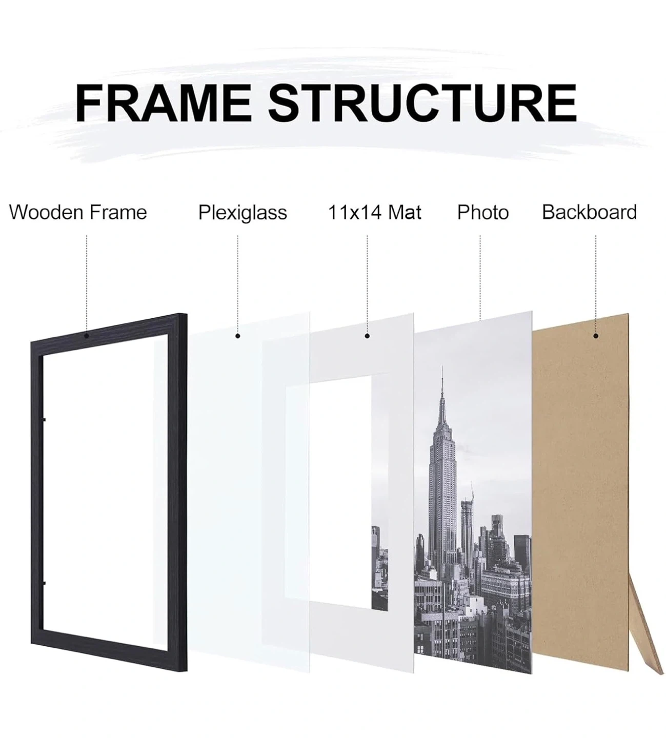 Selling a black Smiry picture frame, sized 16x20 inches. It's made of high-quality wood and includes metal hooks for vertical or horizontal suspension. It can display pictures 11x14 with a mat or 16x20 without a mat. Great for wall or tabletop display!