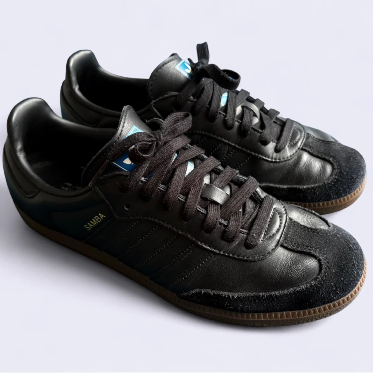 Selling a pair of Adidas Samba shoes in black! These classic sneakers are in great condition and ready for a new home. Perfect for everyday wear or a casual sporty look. They have a leather upper and a gum rubber sole.