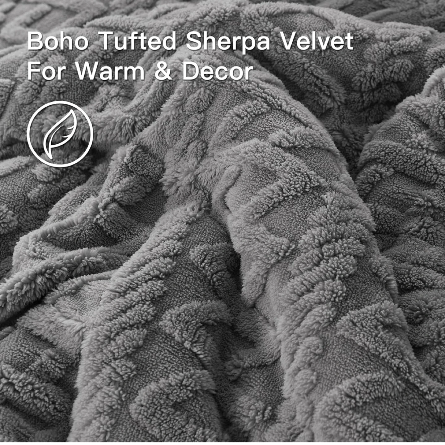 Andency Grey Boho Tufted Sherpa Velvet Comforter Set. Full size