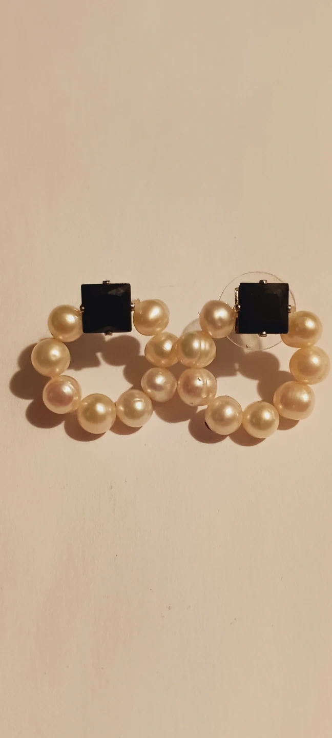 Beautiful elegant genuine Freshwater pearl earrings with a black stone accent. They are in great condition and would make a lovely addition to any outfit !! 1" diameter. Excellent condition. ALL MY PRICES ARE NEGOTIABLE !!