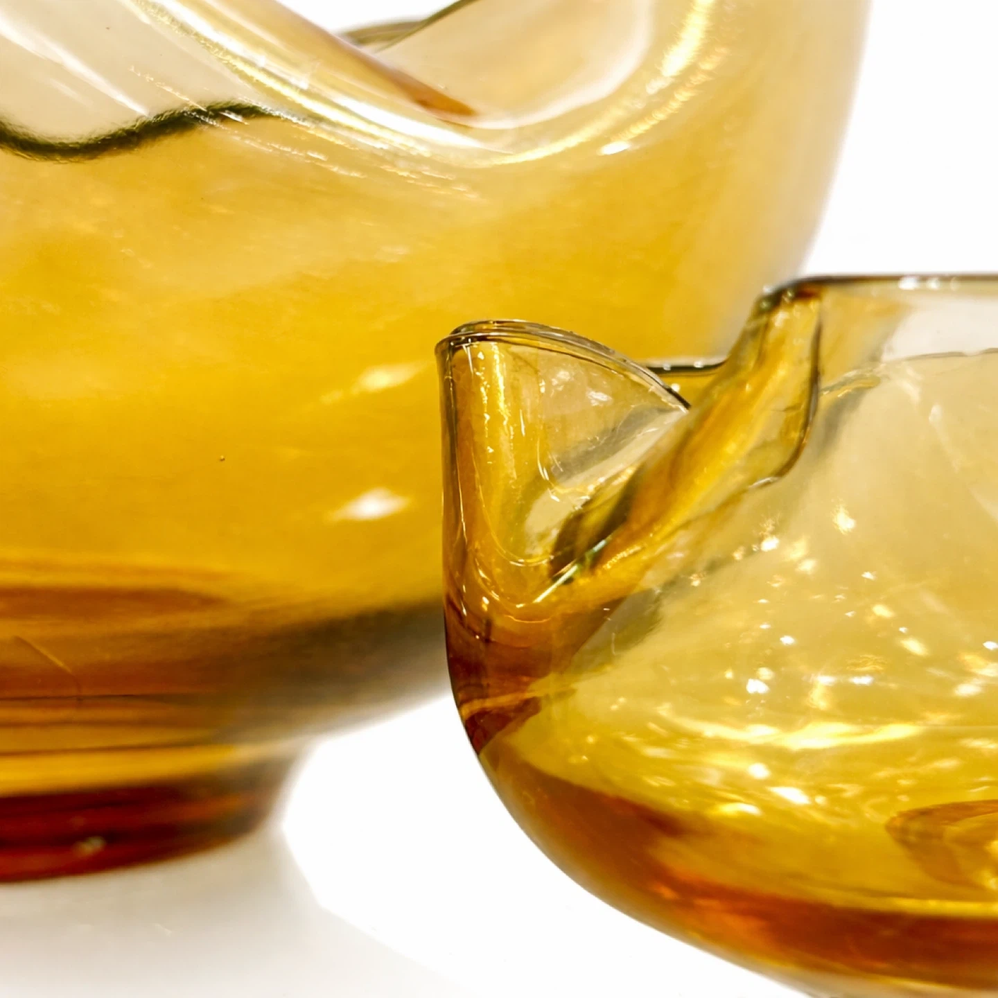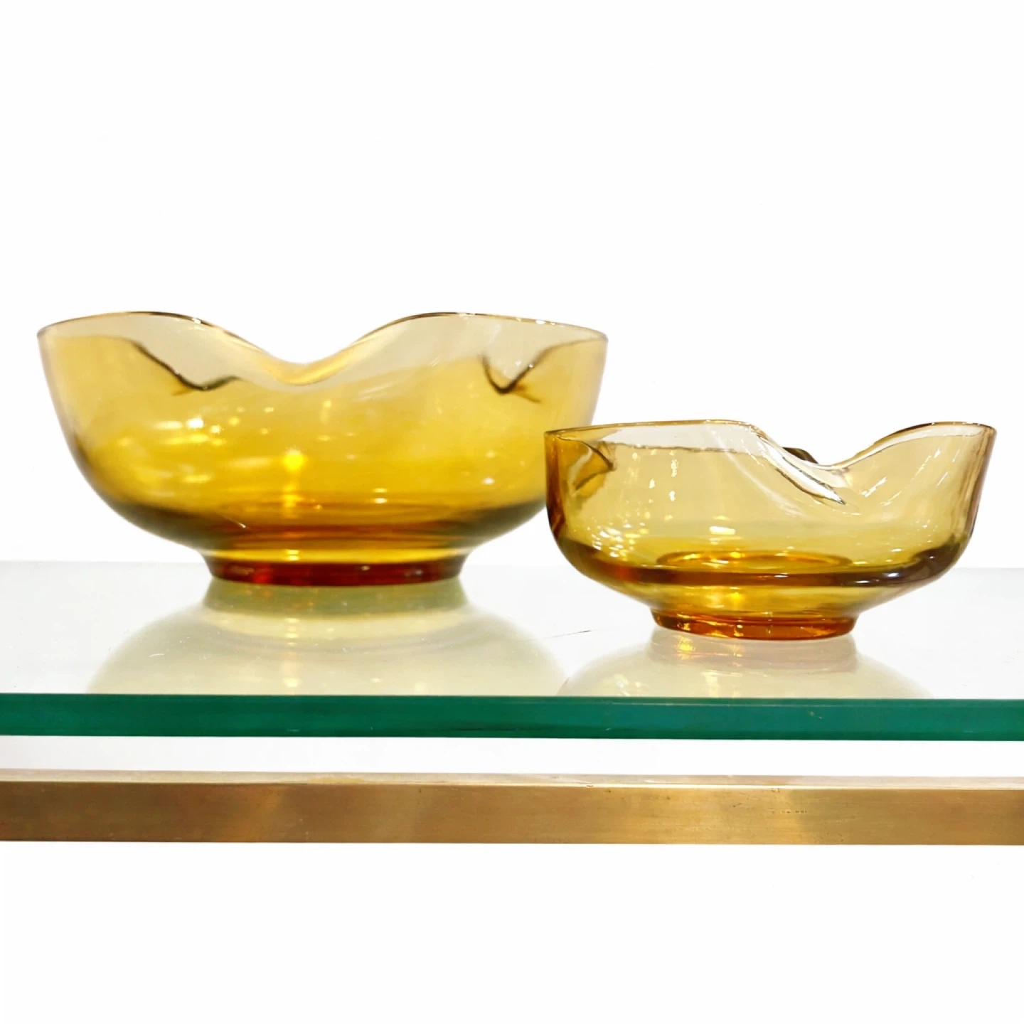 From a private collection; unmarked example consistent with European studio-glass production of the period. A sculptural, light-catching pair of amber art-glass “handkerchief” bowls with softly folded, flower-like rims and substantial weight—exactly the kind of warm-toned Mid-Century table sculpture collectors chase for shelf styling, cocktail credenzas, and curated glass cabinets. The larger bowl reads as a centerpiece; the smaller is a perfect companion for nuts, sweets, jewelry, or a tabletop vignette.