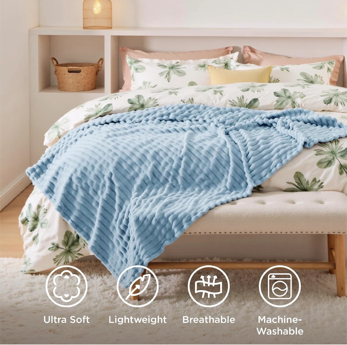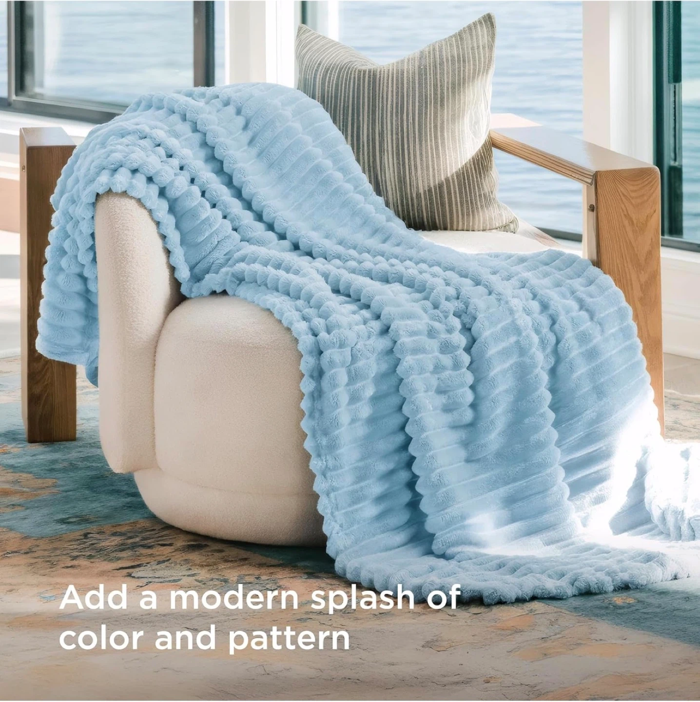 Snuggle up with this super soft Bedsure blanket! It's a king size (108" x 90") in a lovely blue colour. It's lightweight, breathable, and machine washable, making it easy to care for. Add a modern splash of colour and pattern to your bedroom or living room with this cozy blanket. New