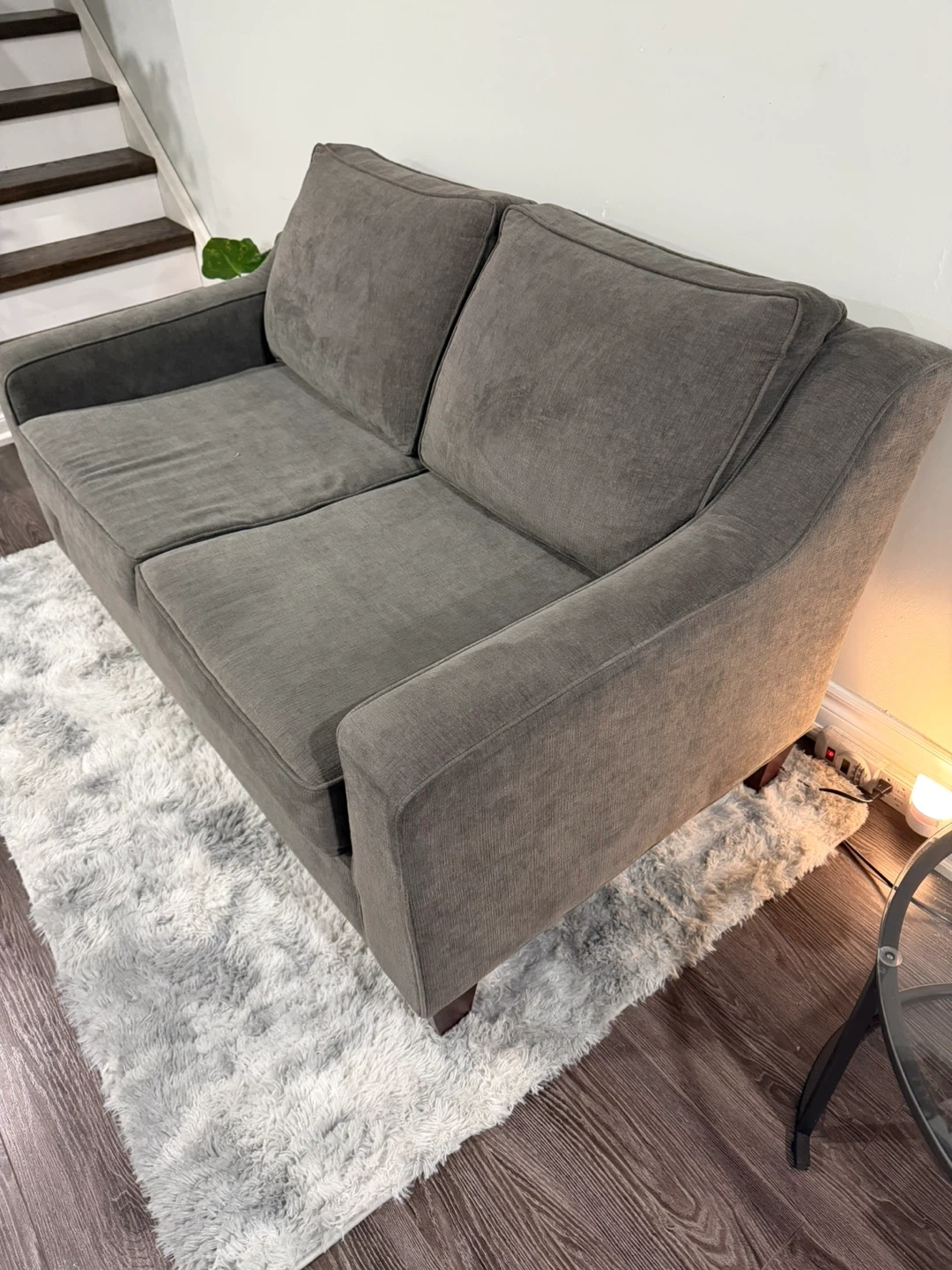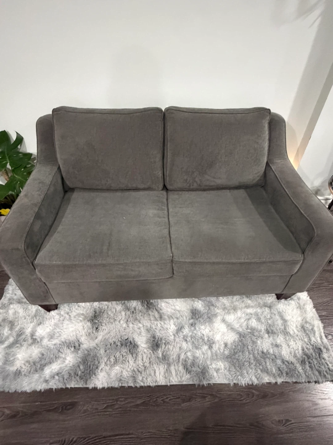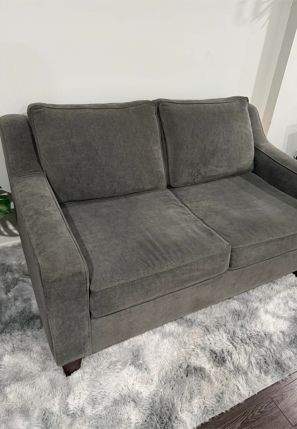 Selling a comfy grey loveseat. It's in great condition and perfect for a smaller space. The cushions are soft and supportive, making it a cozy spot to relax after a long day. It's a great addition to any living room!