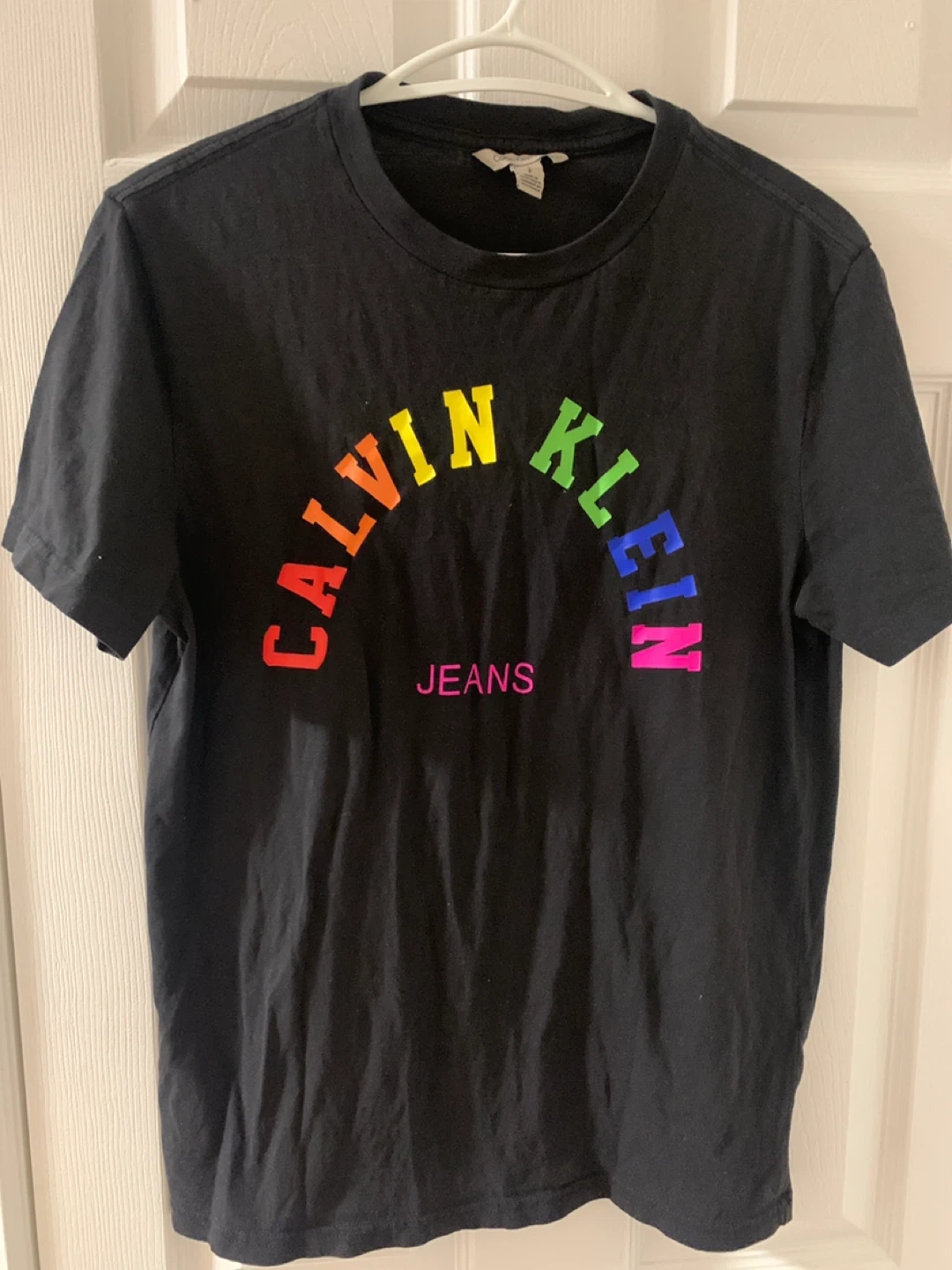 Selling a Calvin Klein Jeans t-shirt with a fun rainbow logo! It's black and in great condition. This is a stylish and comfortable tee that's perfect for everyday wear