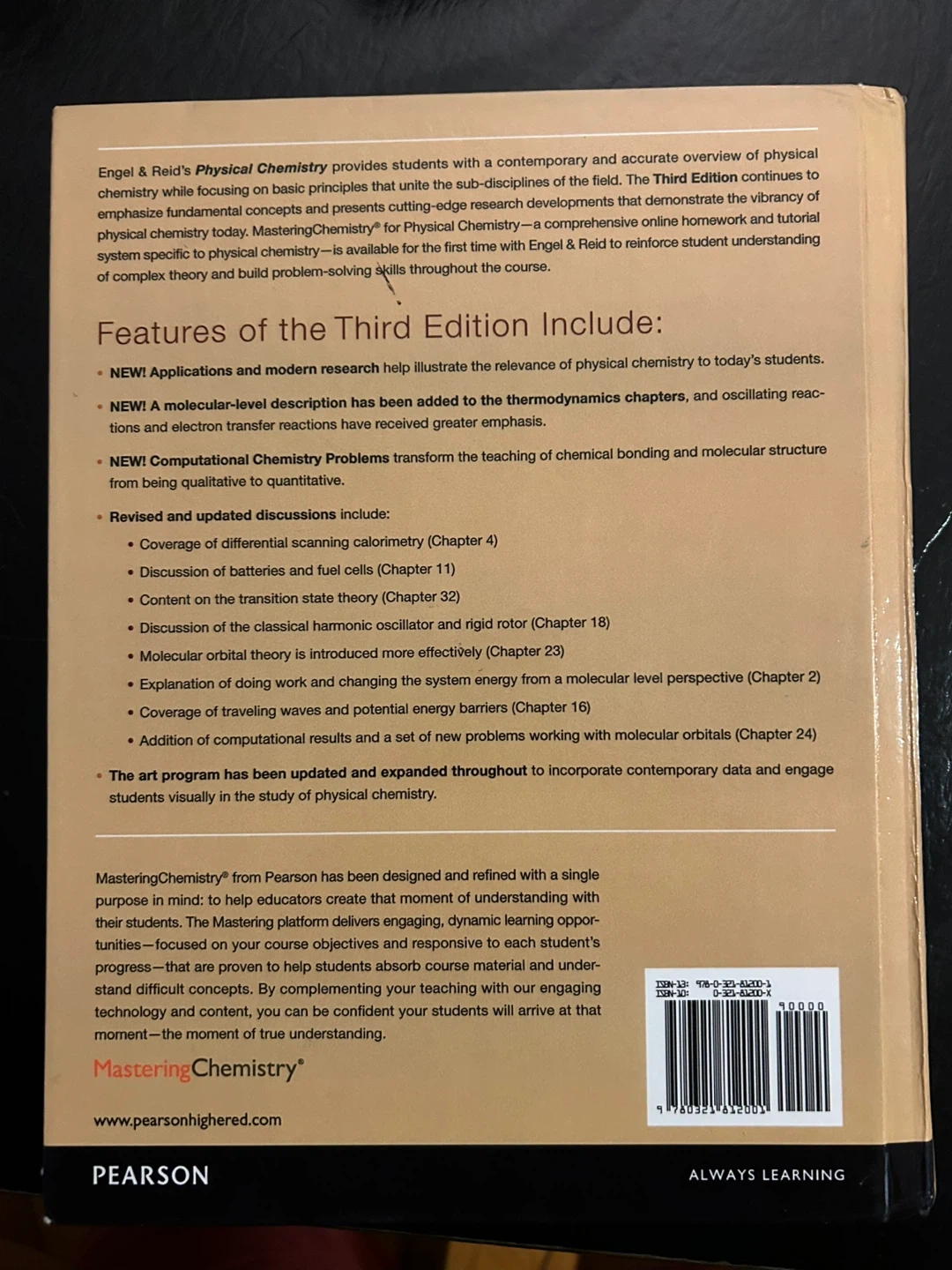Selling a used copy of "Physical Chemistry" Third Edition by Thomas Engel and Philip Reid. This textbook provides a contemporary and accurate overview of physical chemistry while focusing on basic principles. It includes applications and modern research to illustrate the relevance of physical chemistry to today's students. MasteringChemistry is available for online homework and tutorial.