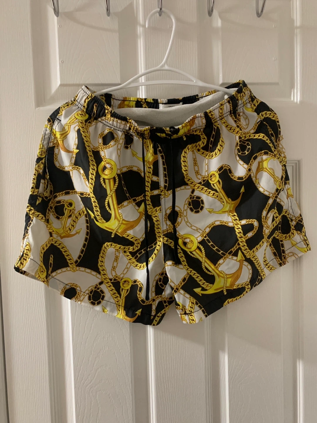 Selling a pair of men's swim trunks with a unique anchor and chain print! These are perfect for the summer. They feature a black, white, and gold colour scheme that really stands out. Great for the beach or pool!