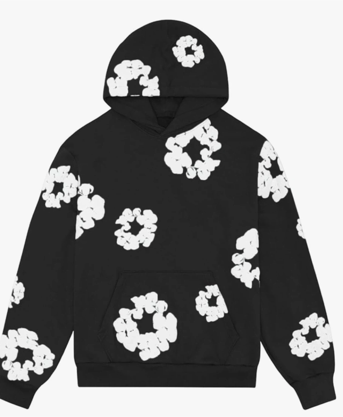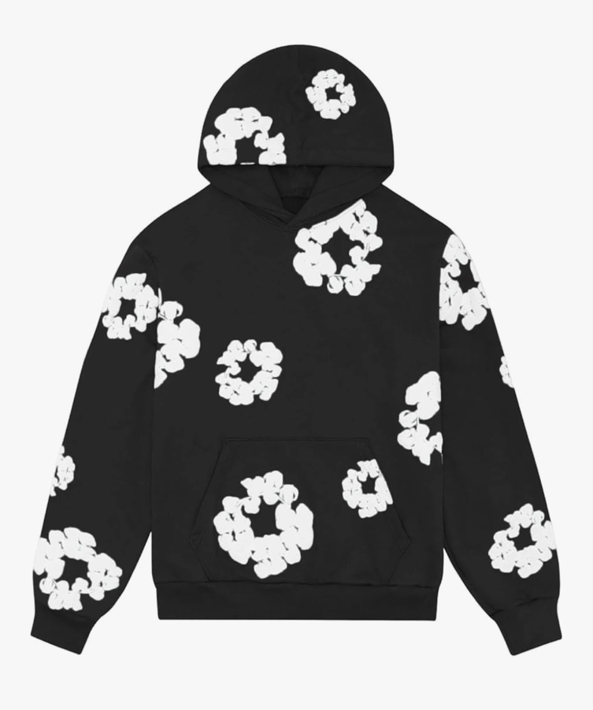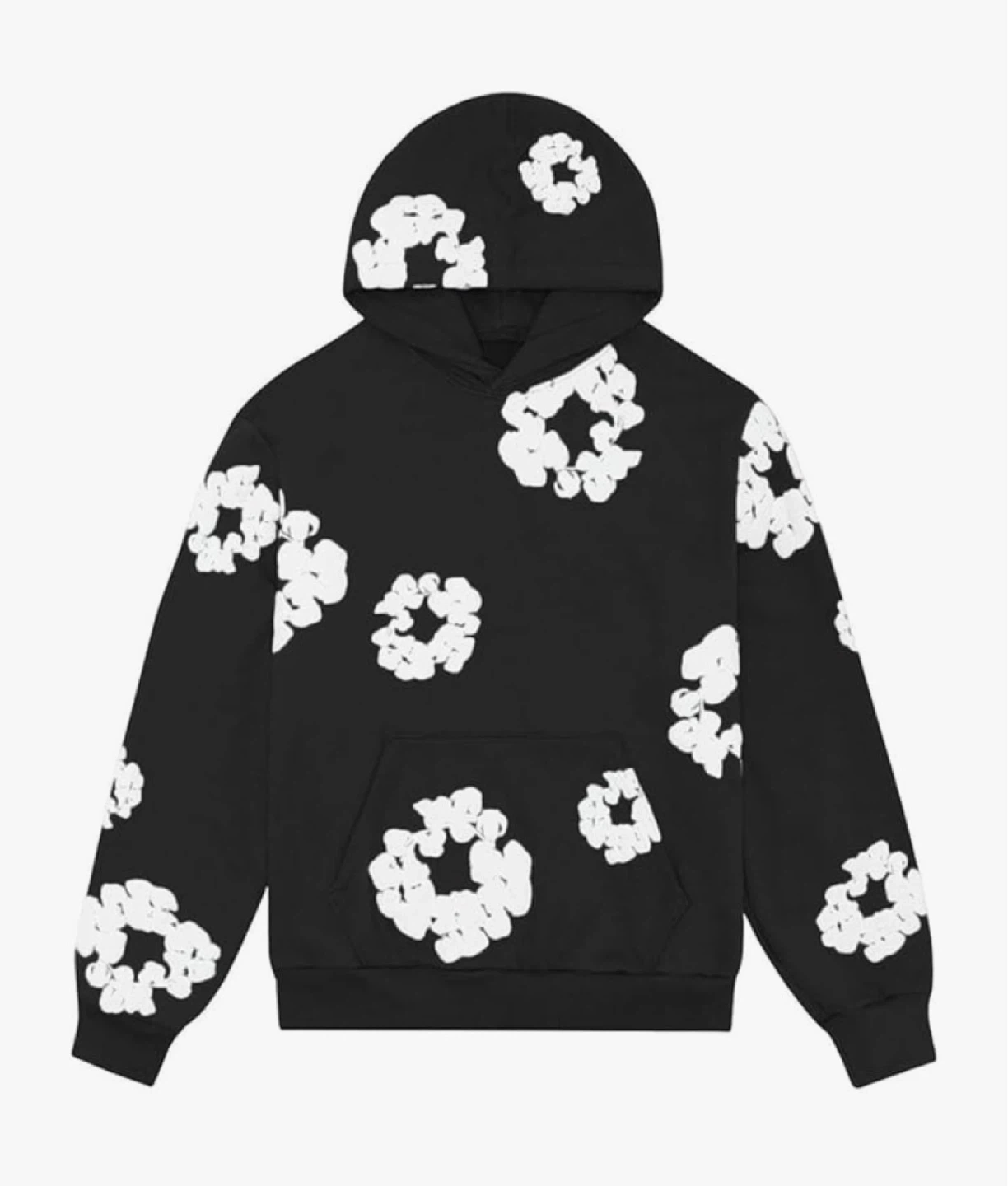 Selling a black hoodie with a white floral print. It's in great condition,super comfy! And it went viral The hoodie has a relaxed fit and a kangaroo pocket in the front. Perfect for layering or just lounging around the house and u can have it in any time but I put the date cuz I have to