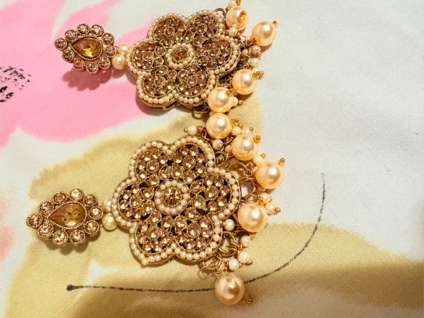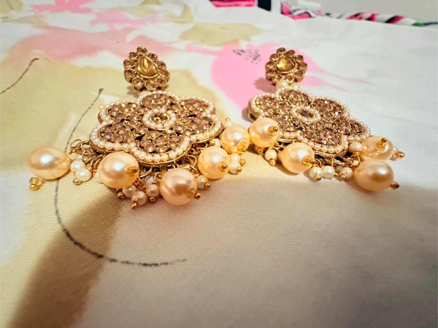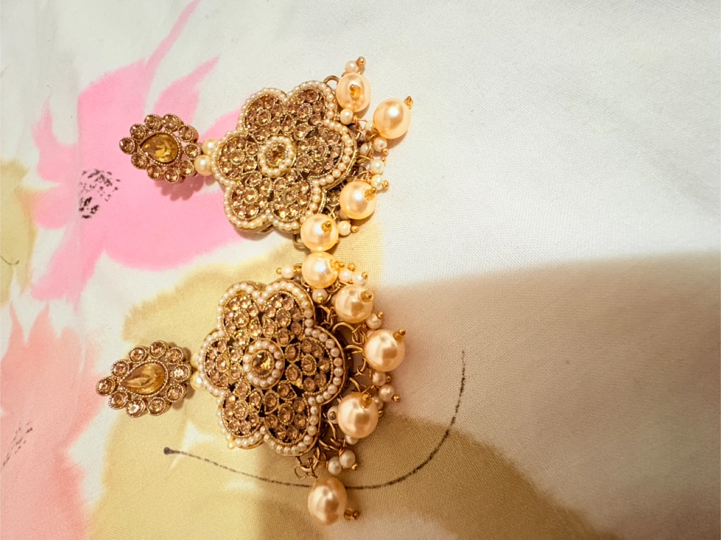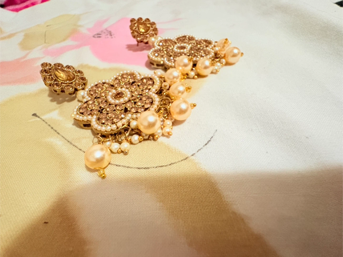 Beautiful gold-tone earrings featuring a floral design and pearl accents. They're in great condition and ready to add a touch of elegance to your outfit!
