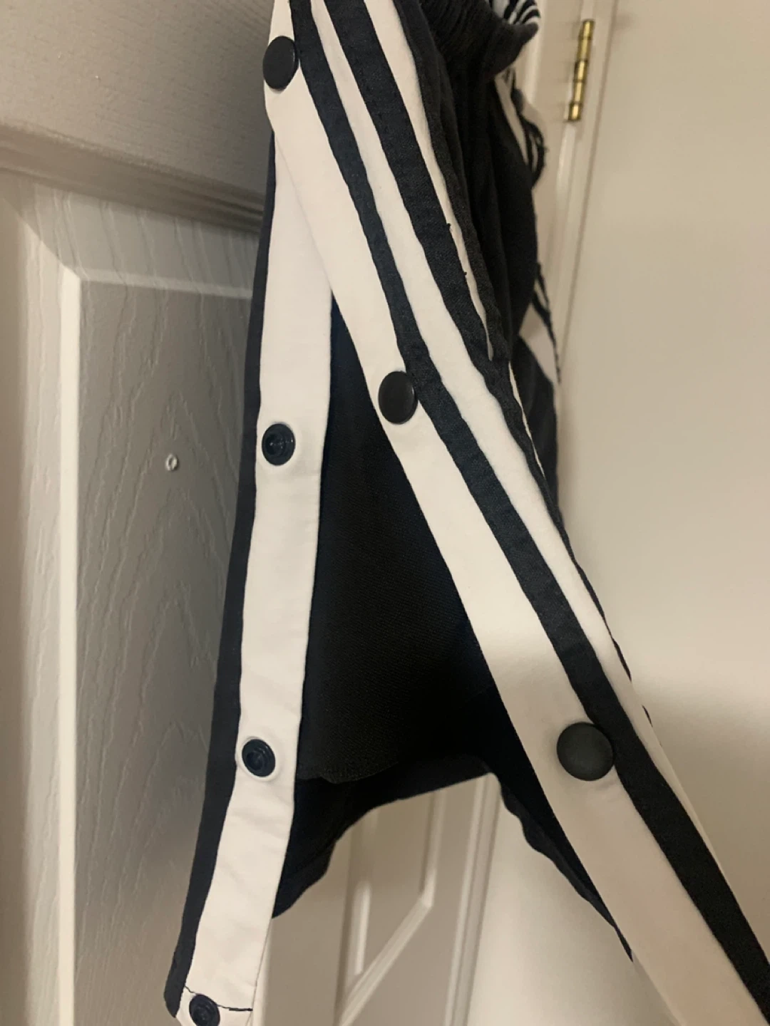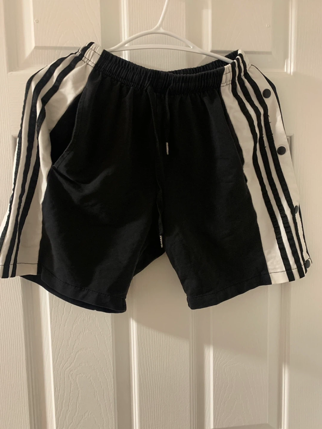 Selling a pair of Adidas shorts in black with white stripes. They're in great condition and feature a comfortable elastic waistband with a drawstring. Perfect for casual wear or sports activities!