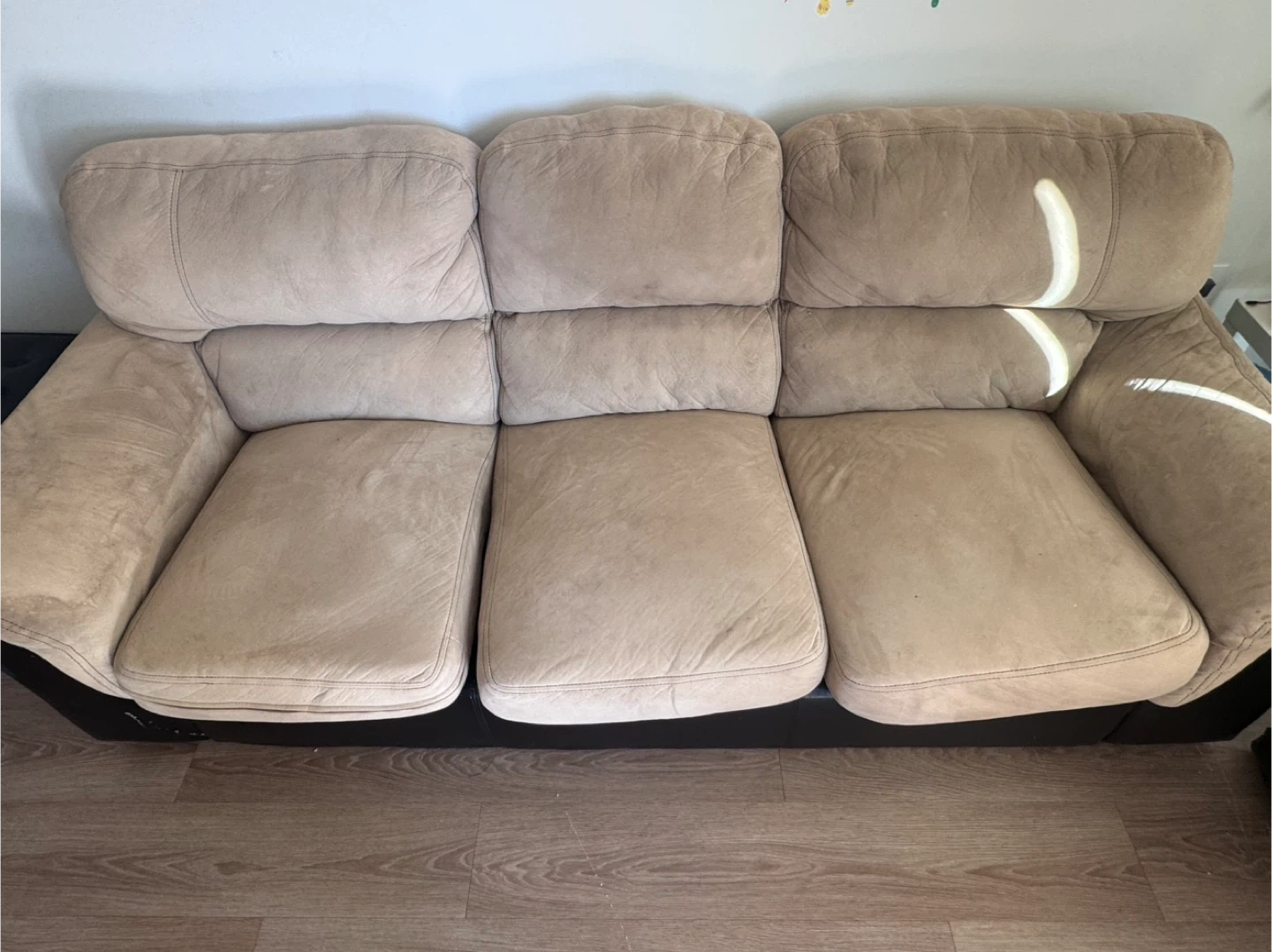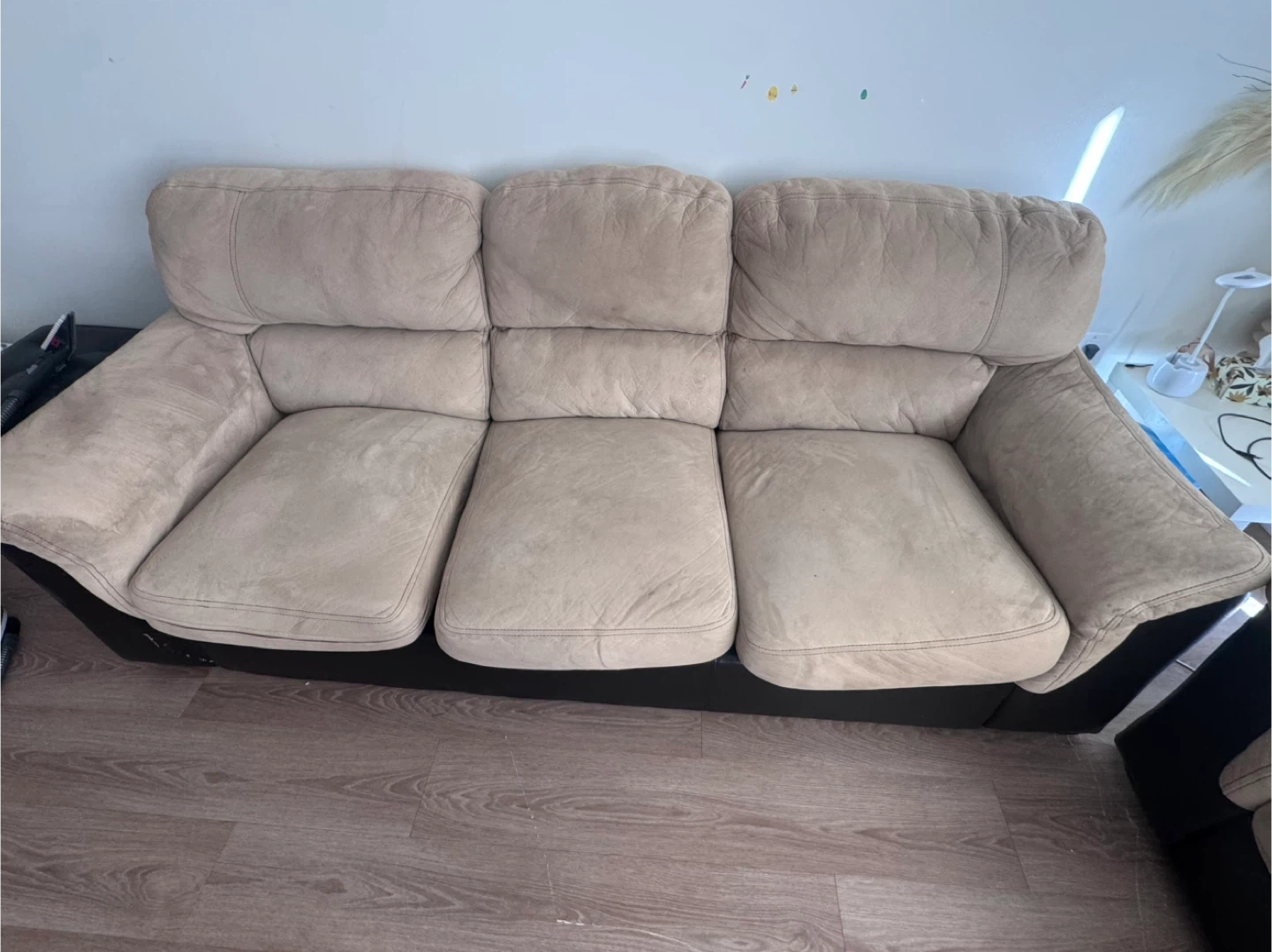 Selling a comfy beige three-seat sofa! It's in good condition and ready for a new home. Perfect for a living room or den Pet and smoke free