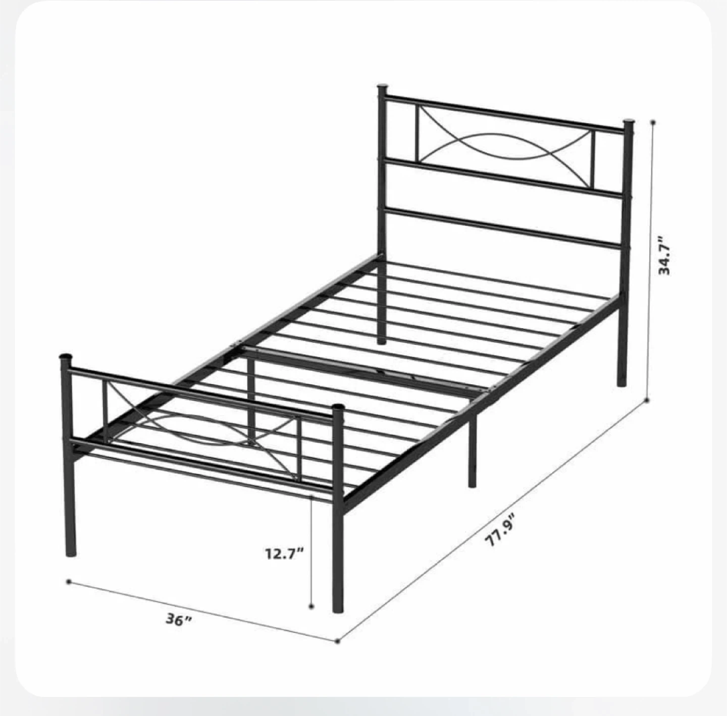Selling a newly bought twin size bed frame with a metal frame! It's in great condition and ready for a new home. The frame is black and measures approximately 77.9" in length, 36" in width, and 34.7" in height. Perfect for a small space , student or working professional or a kid's room!