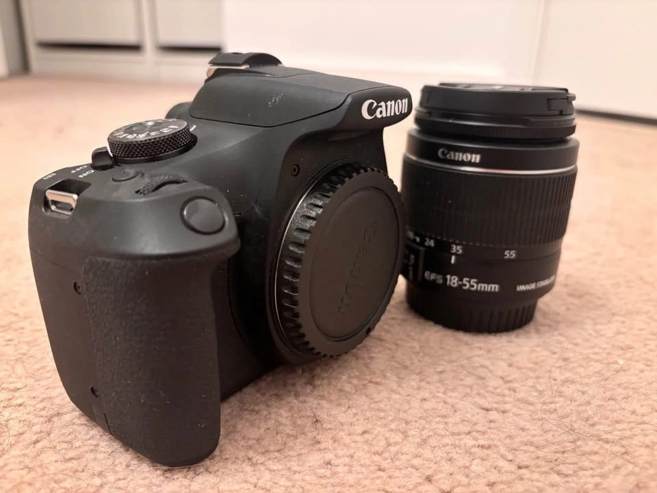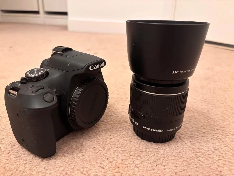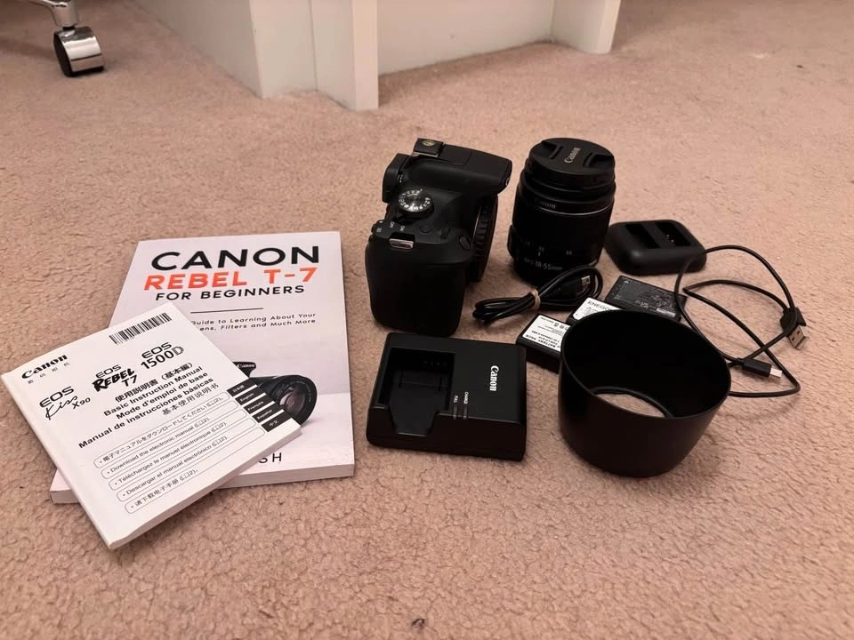 Canon Rebel T7 camera with 18-55mm lens, three batteries, two chargers, two cables, lens hood, handbook and instructions. Used under 3 times. Selling for a family member as they found it difficult to use. Great condition and a great camera for beginners.