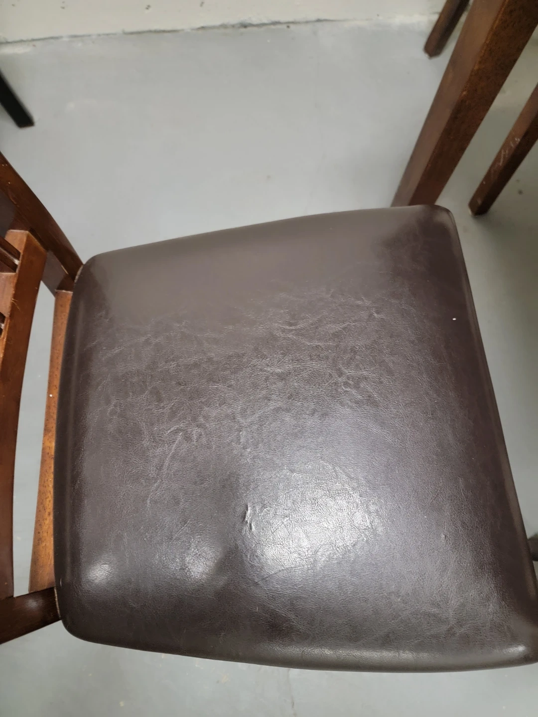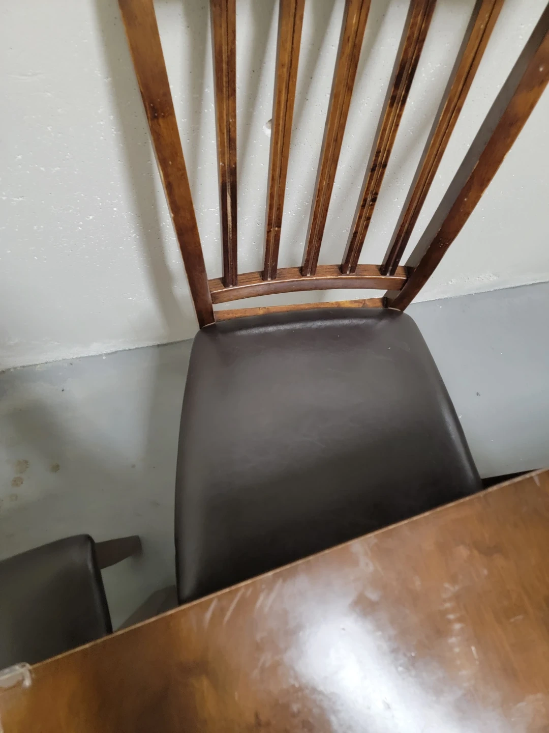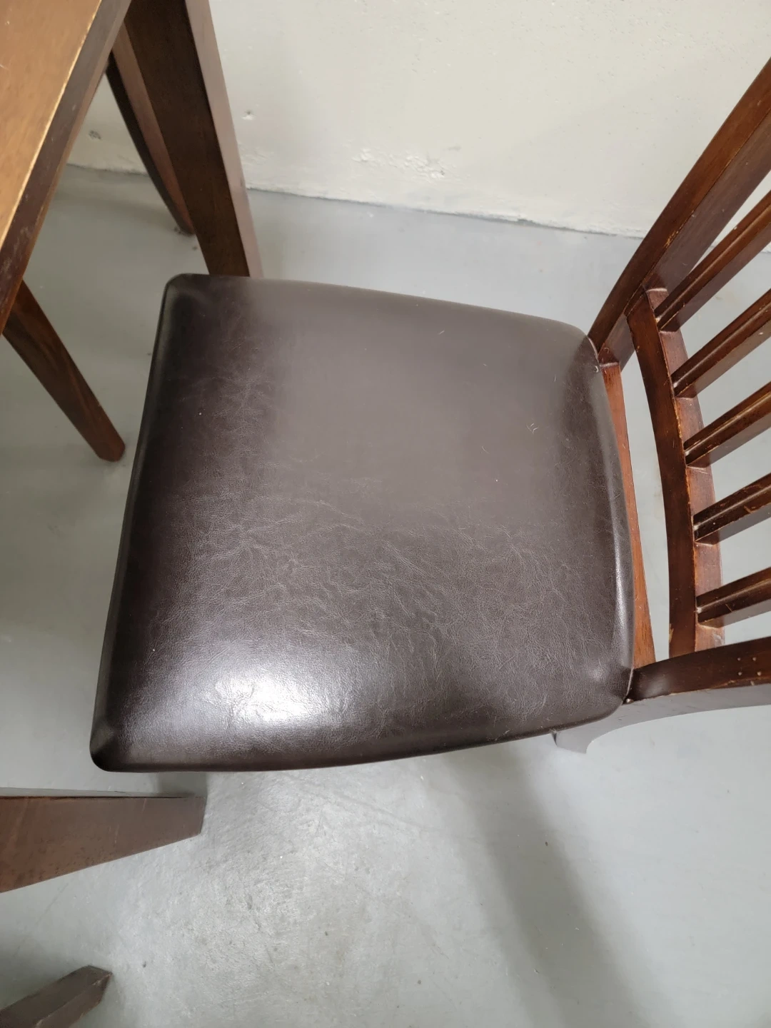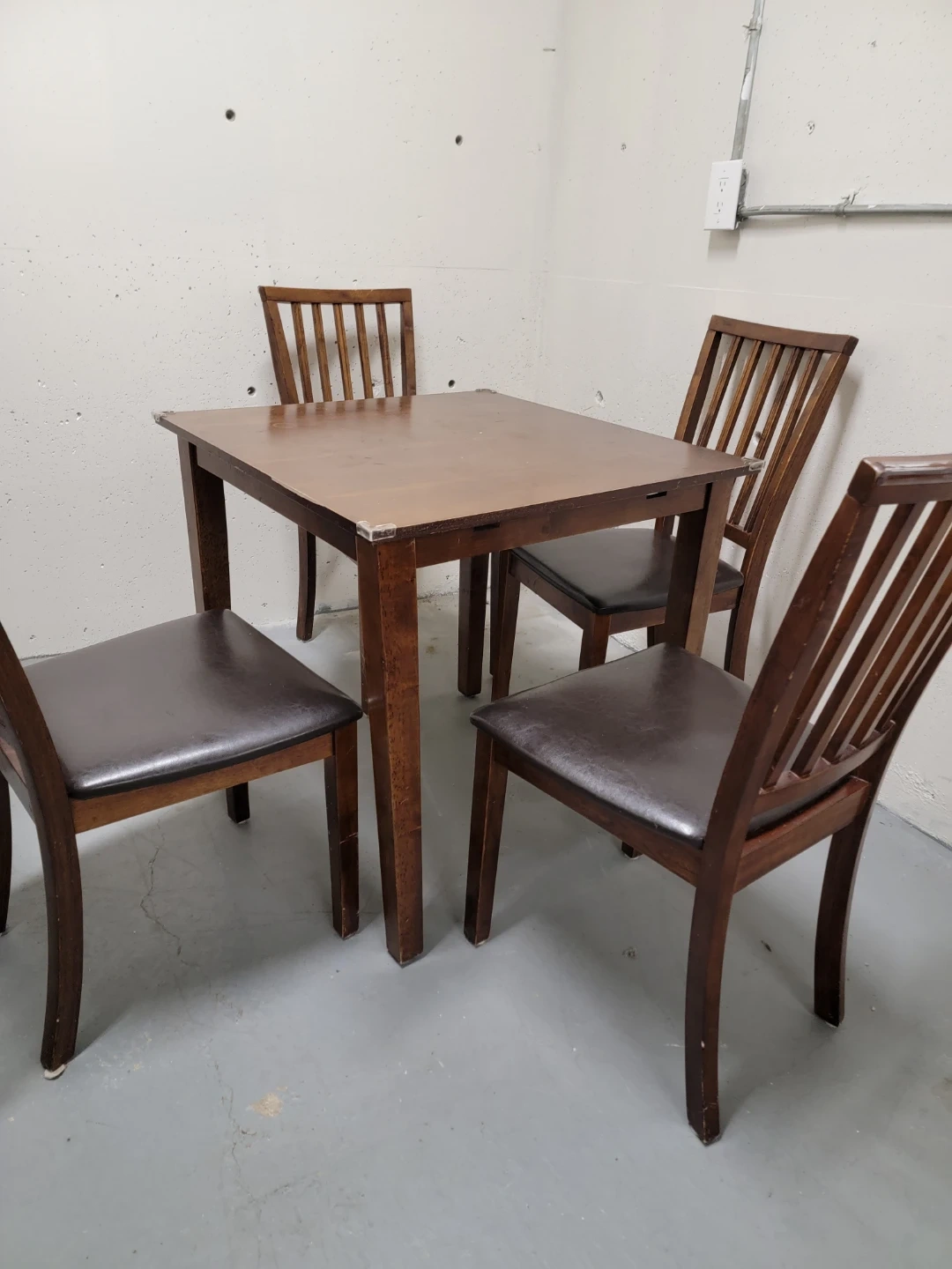 Dining table with four chairs. The table is made of wood, and the chairs have brown leather seats. Great for a small dining room or kitchen!