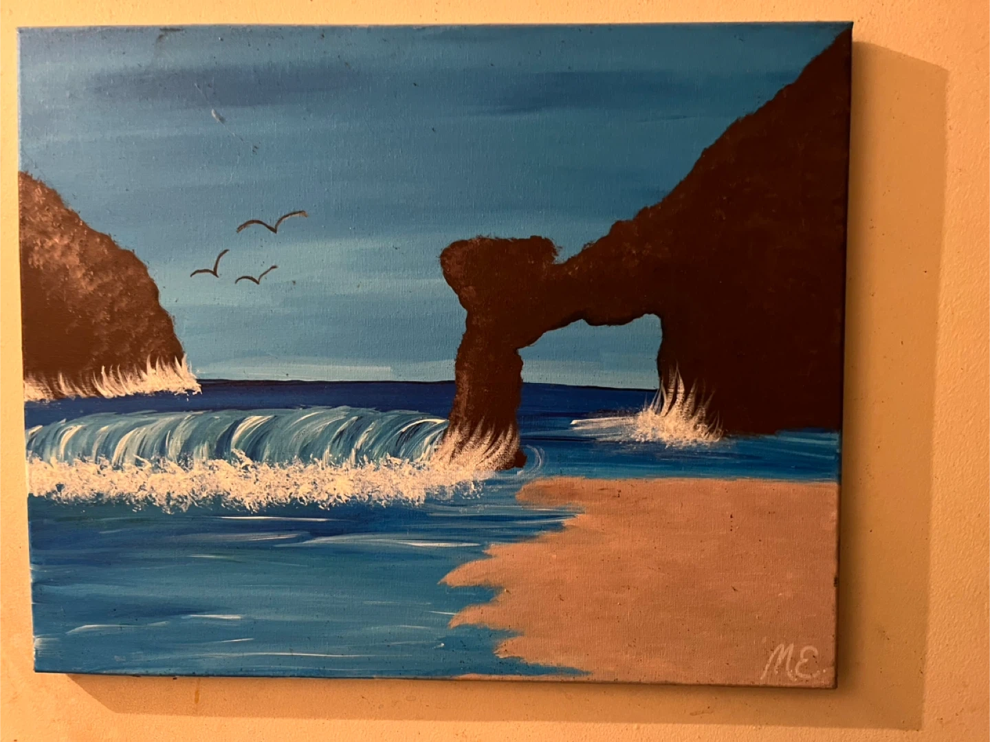A lovely seascape painting featuring waves crashing on a sandy beach with rocky cliffs in the background. The painting is signed in the corner with the initials 'ME'.