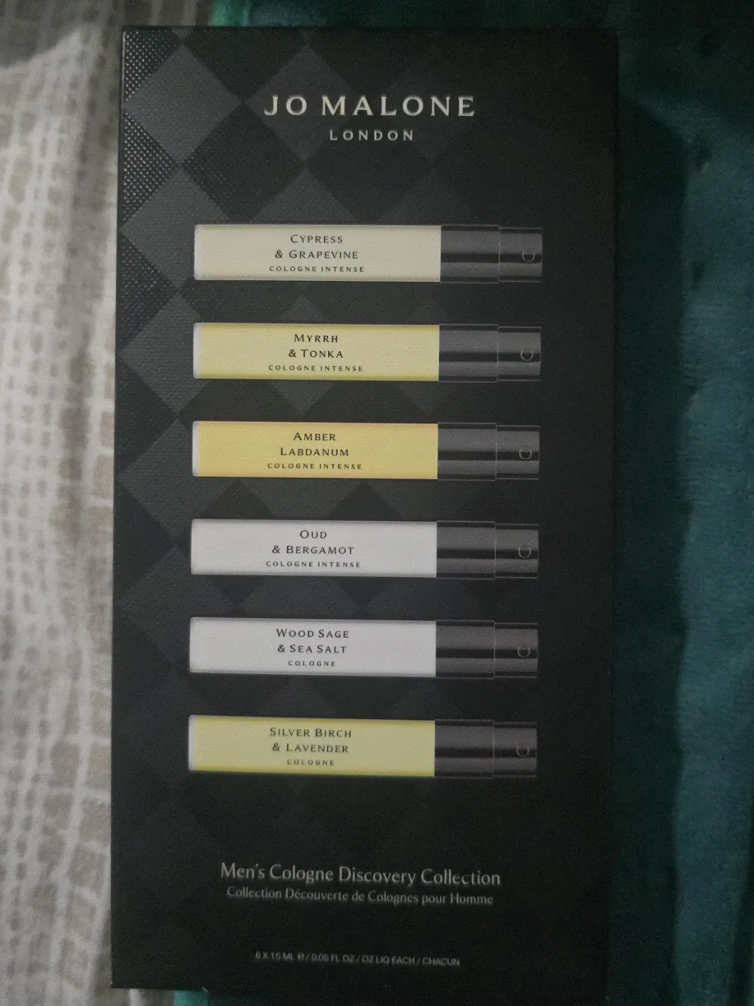 Selling a Jo Malone Men's Cologne Discovery Collection! It includes six different colognes: Cypress & Grapevine, Myrrh & Tonka, Amber Labdanum, Oud & Bergamot, Wood Sage & Sea Salt, and Silver Birch & Lavender. Each cologne is 1.5ml (0.05 fl oz)