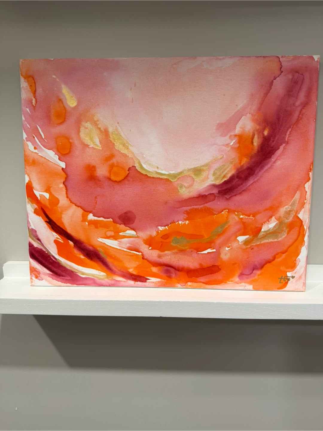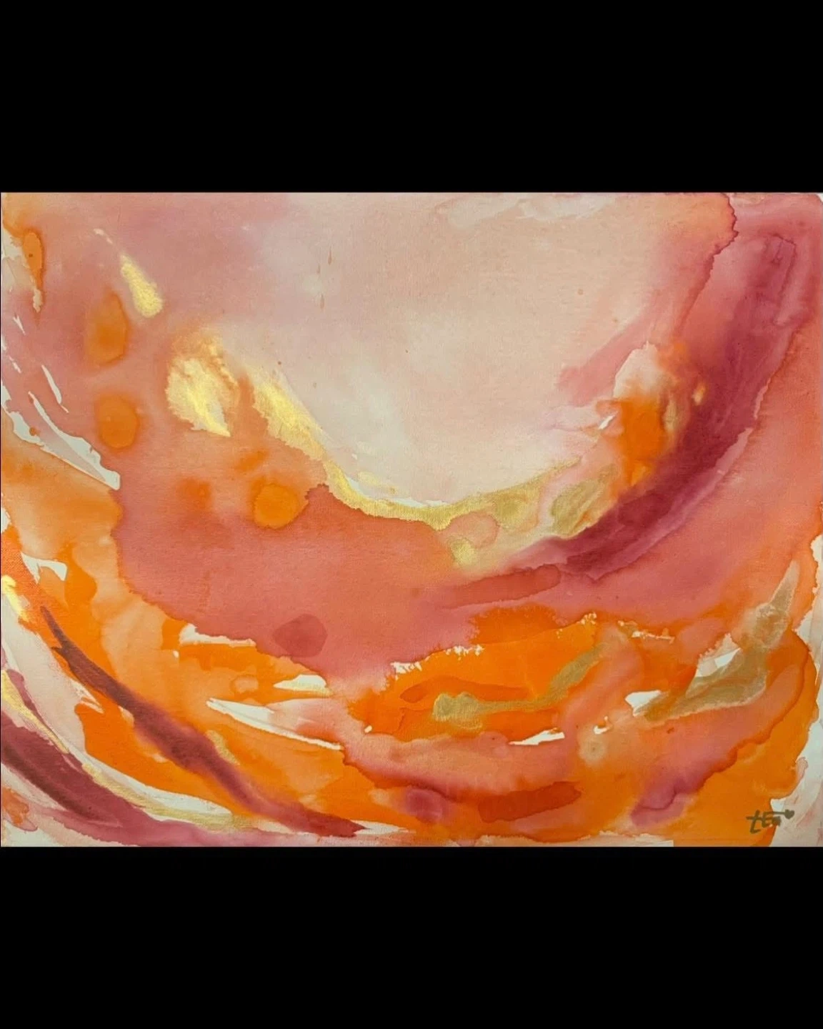 Original Abstract Fluid Acrylic Art featuring warm vibrant tones with shimmers of gold on 20” X 16” stretched canvas stapled to a solid wood frame. This is not a print. Signature on bottom right.