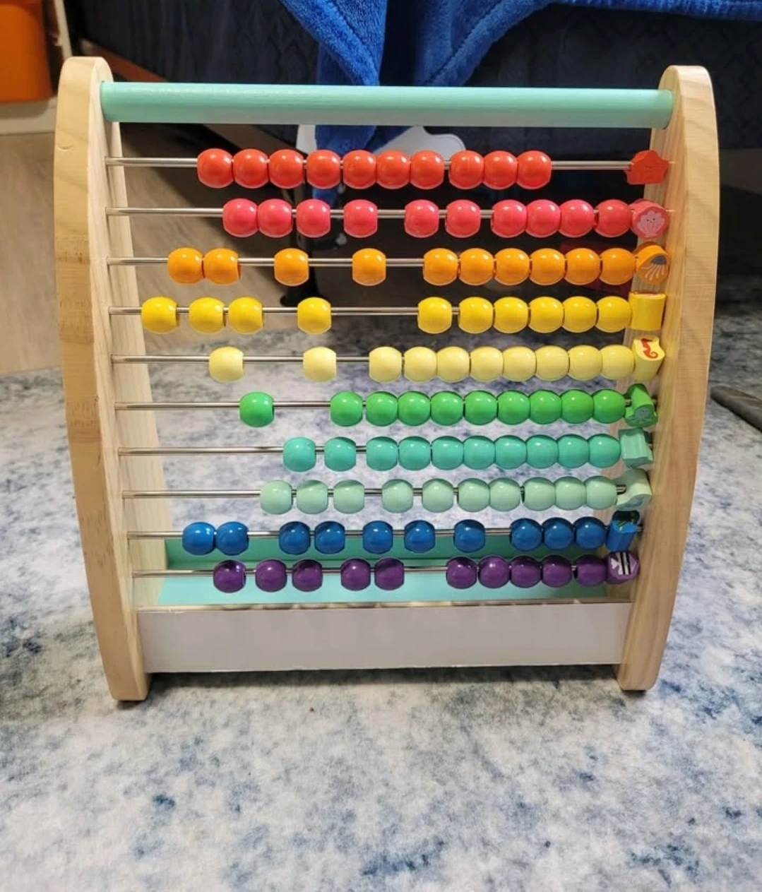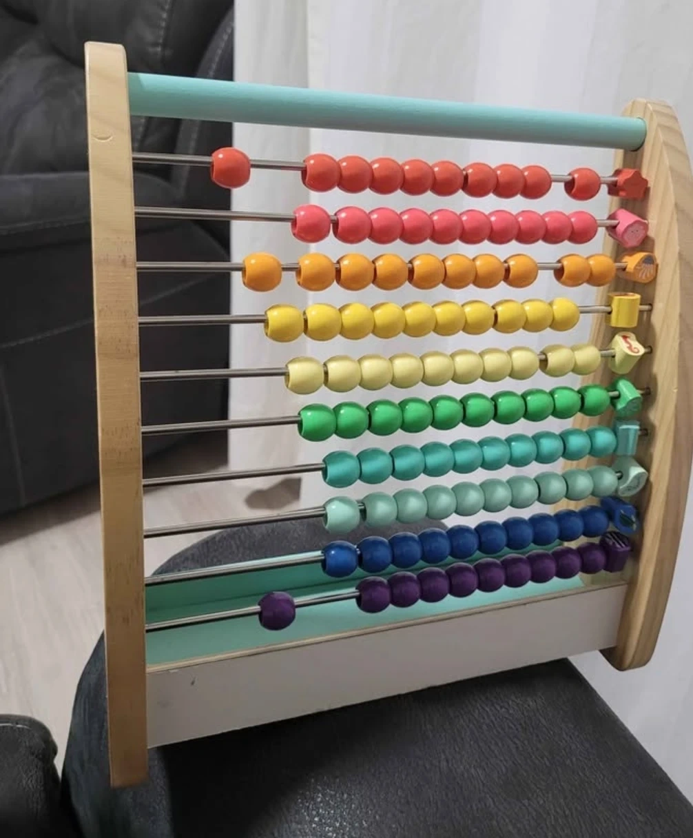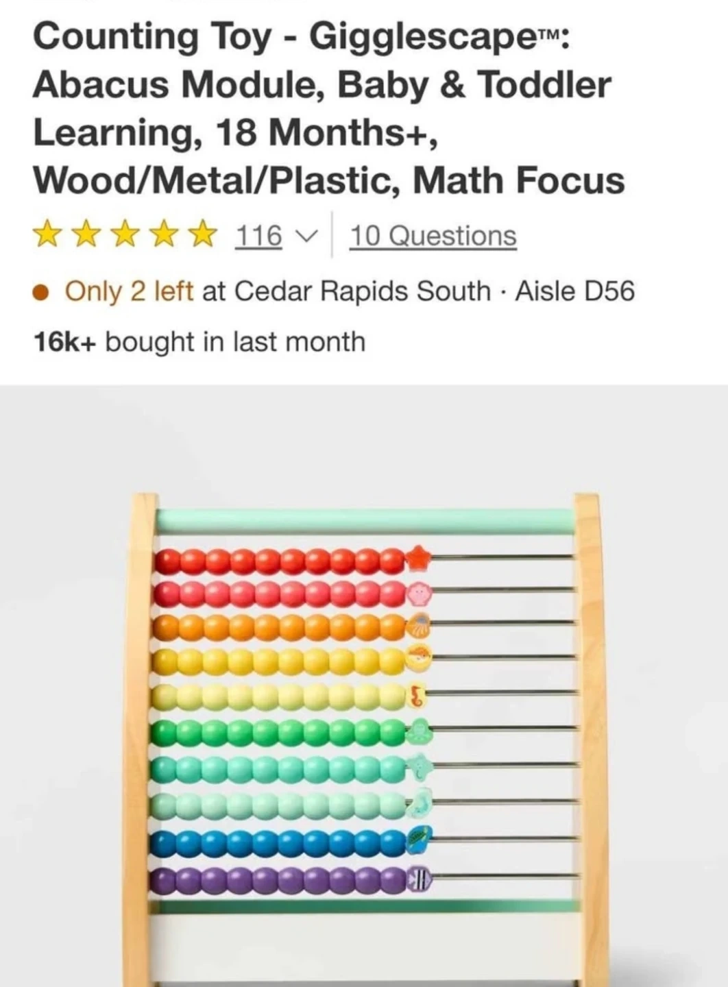 Selling a Gigglescape abacus module, perfect for baby and toddler learning! It's designed for ages 18 months and up, and focuses on math skills. The abacus is made with a mix of wood, metal, and plastic, and features colourful beads to make learning fun