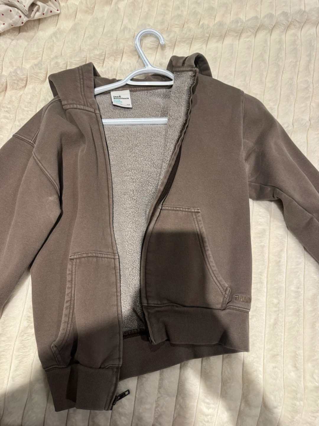 Selling a TNA Sweatfleece Cozy Fleece zip-up hoodie in size 2XS. It's a perfect fit and super comfy for those cooler days! There's a small stain on the sleeve, but otherwise it's in great condition