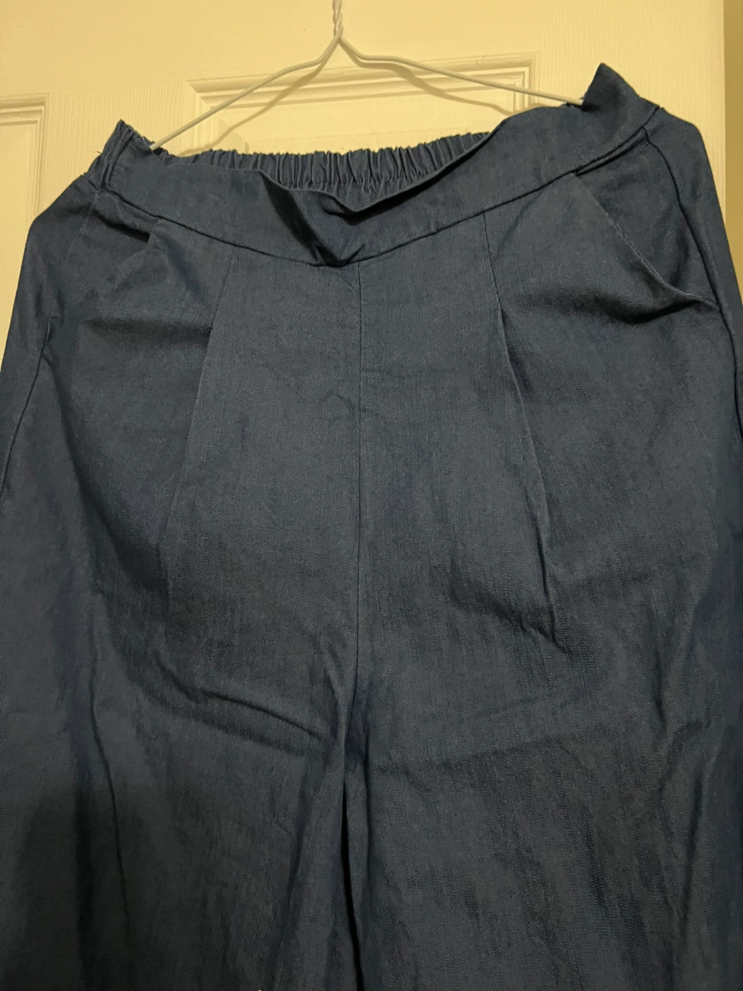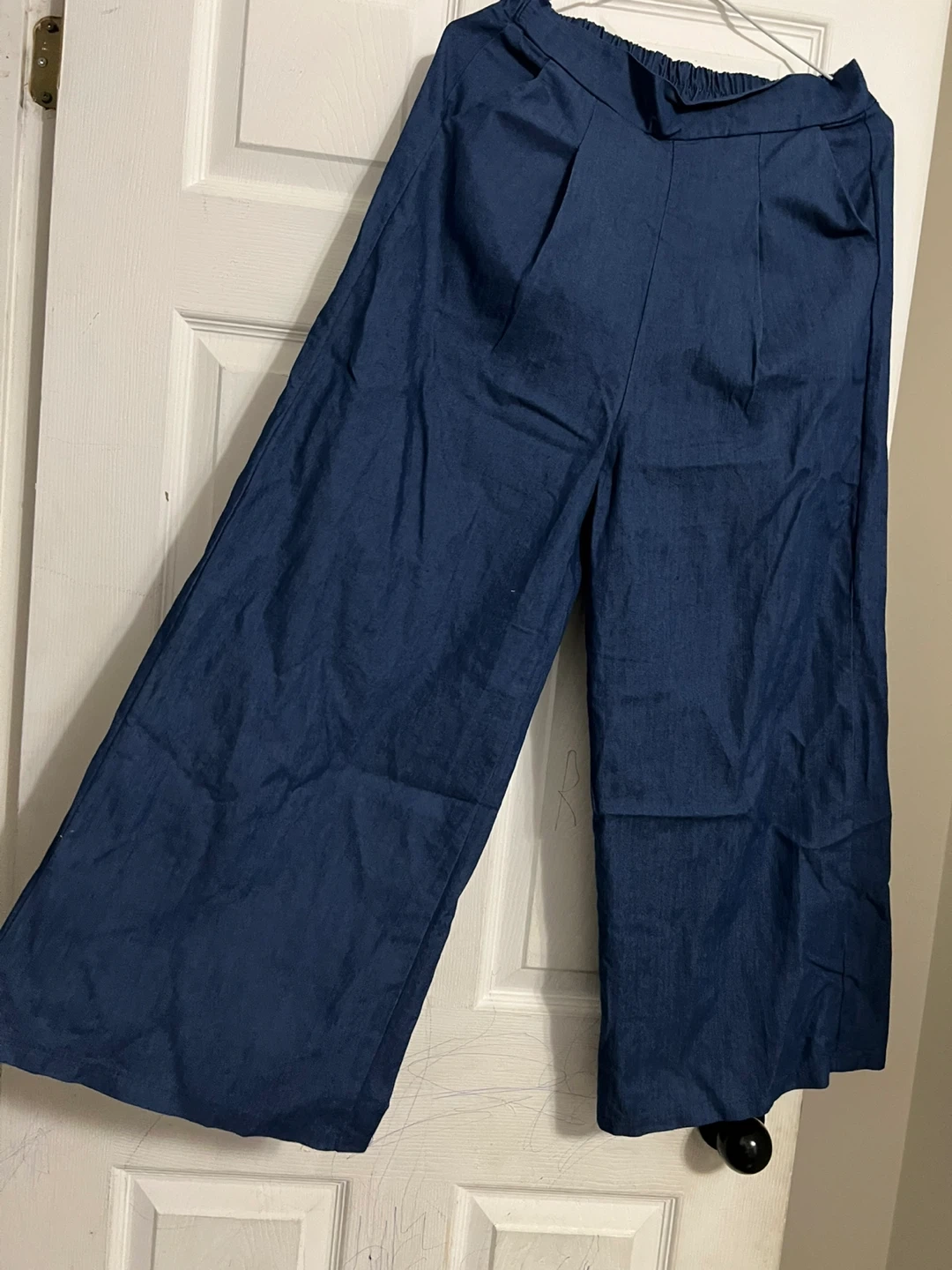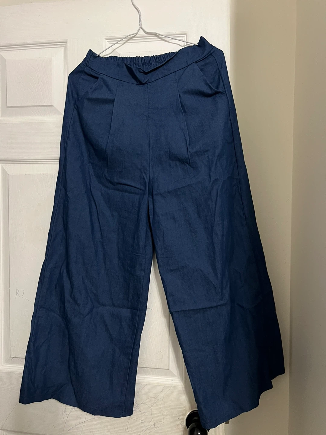 Selling a pair of blue wide-leg cropped pants. They're a stylish and comfortable addition to any wardrobe! The wide-leg design and cropped length make them perfect for warmer weather or for creating a trendy, relaxed look