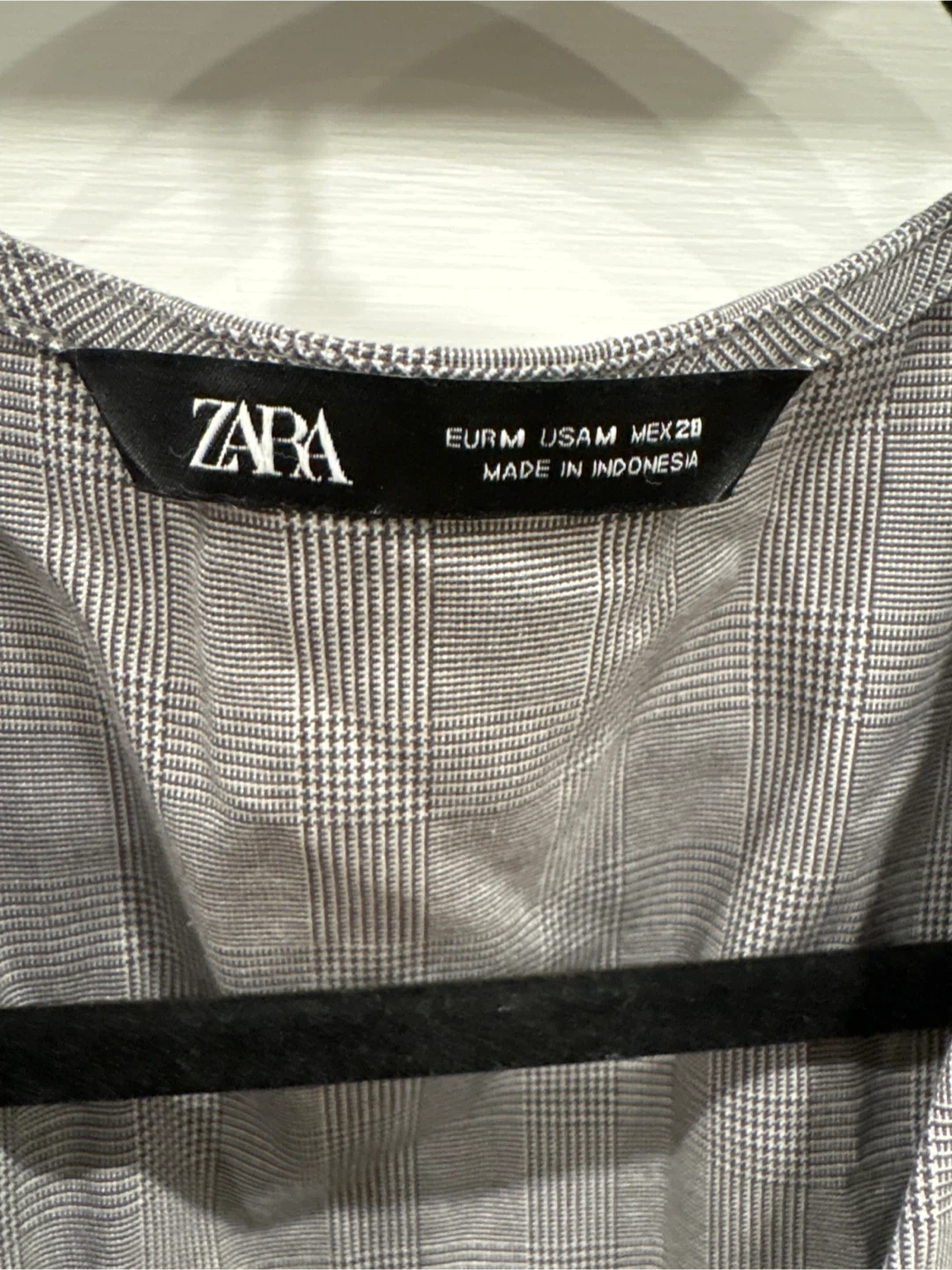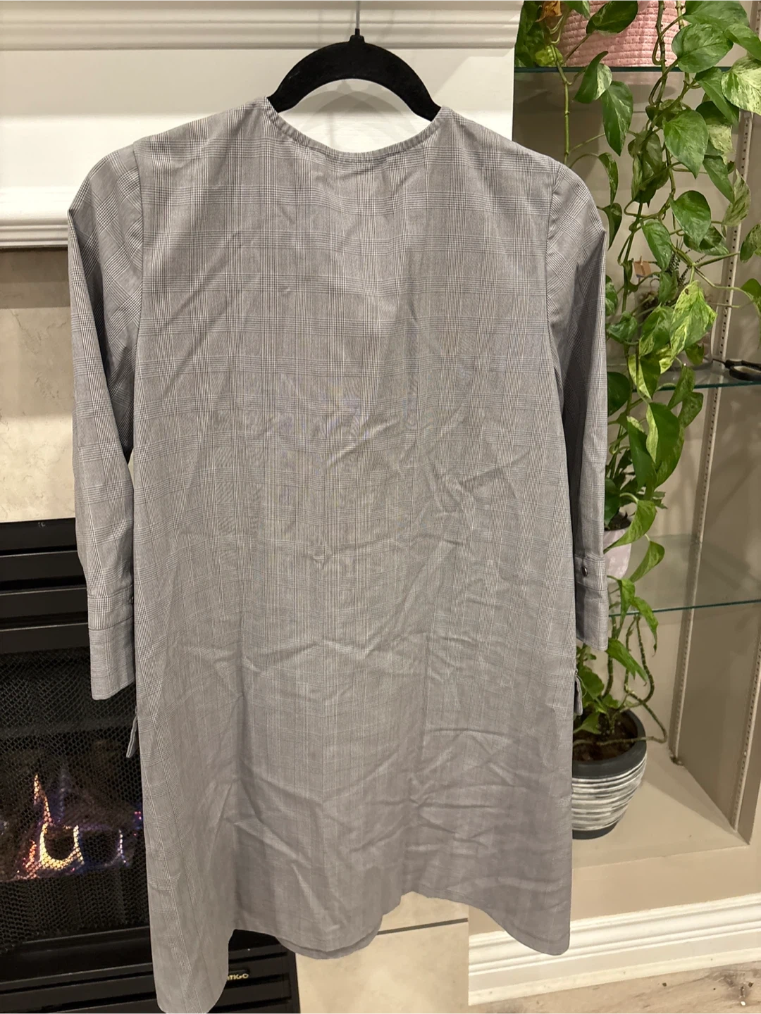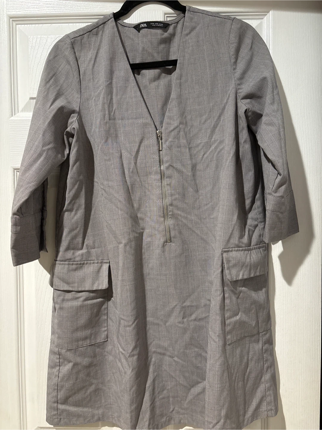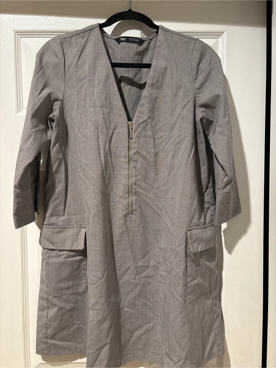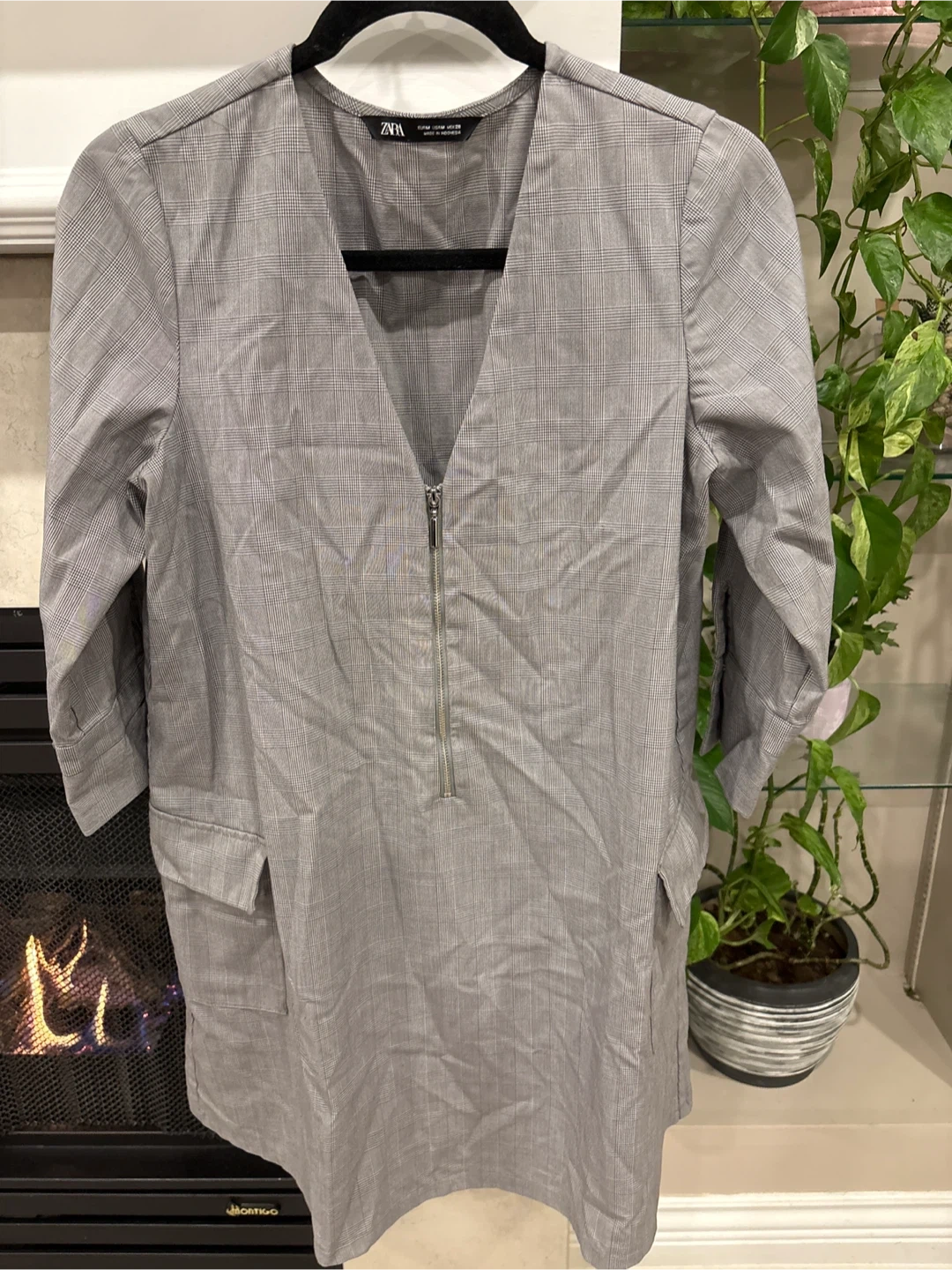 Zara dress in a grey plaid pattern. It features a V-neck and a zipper down the front. The size is M.
