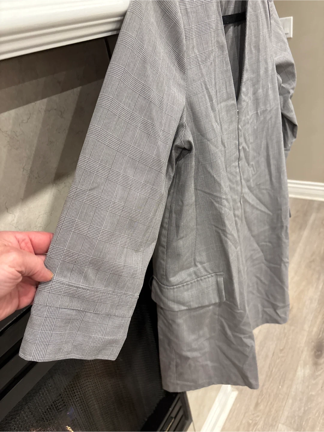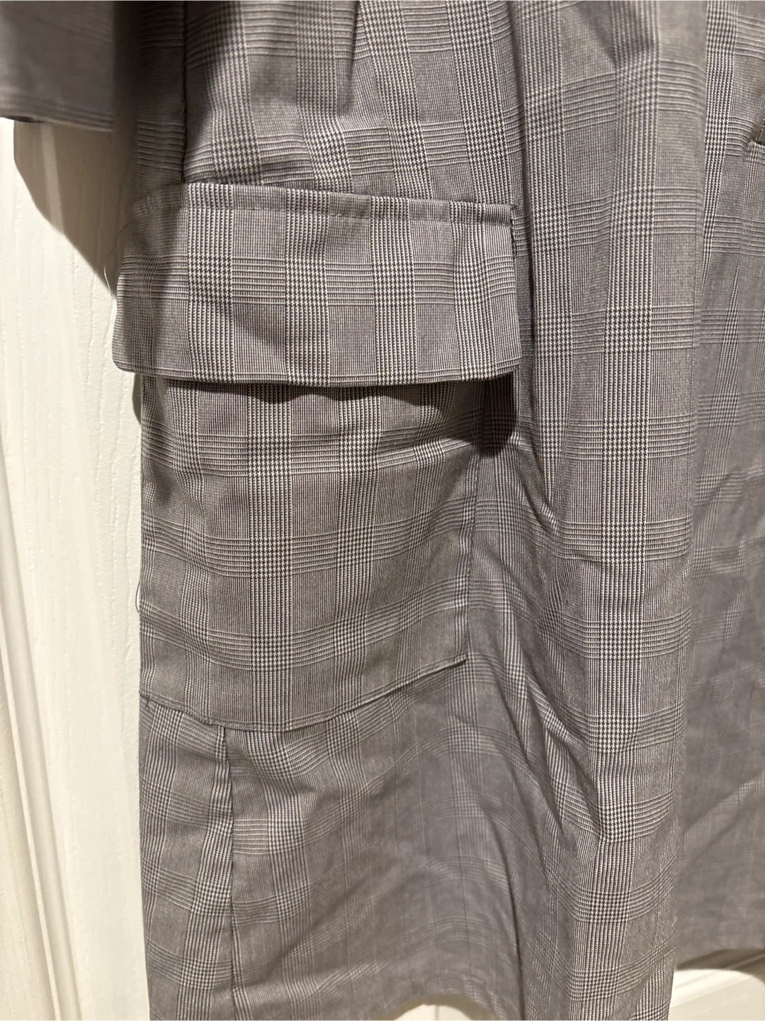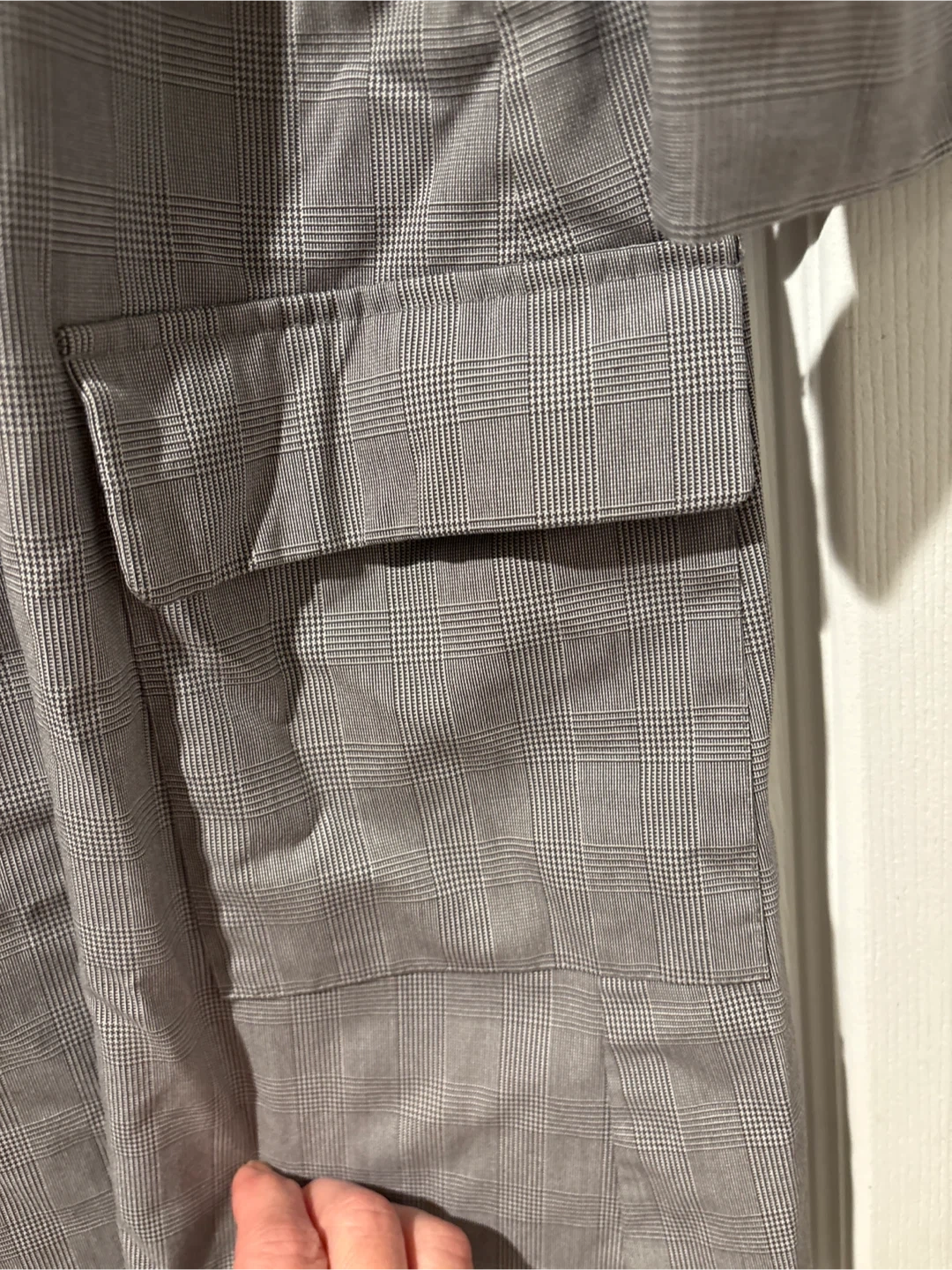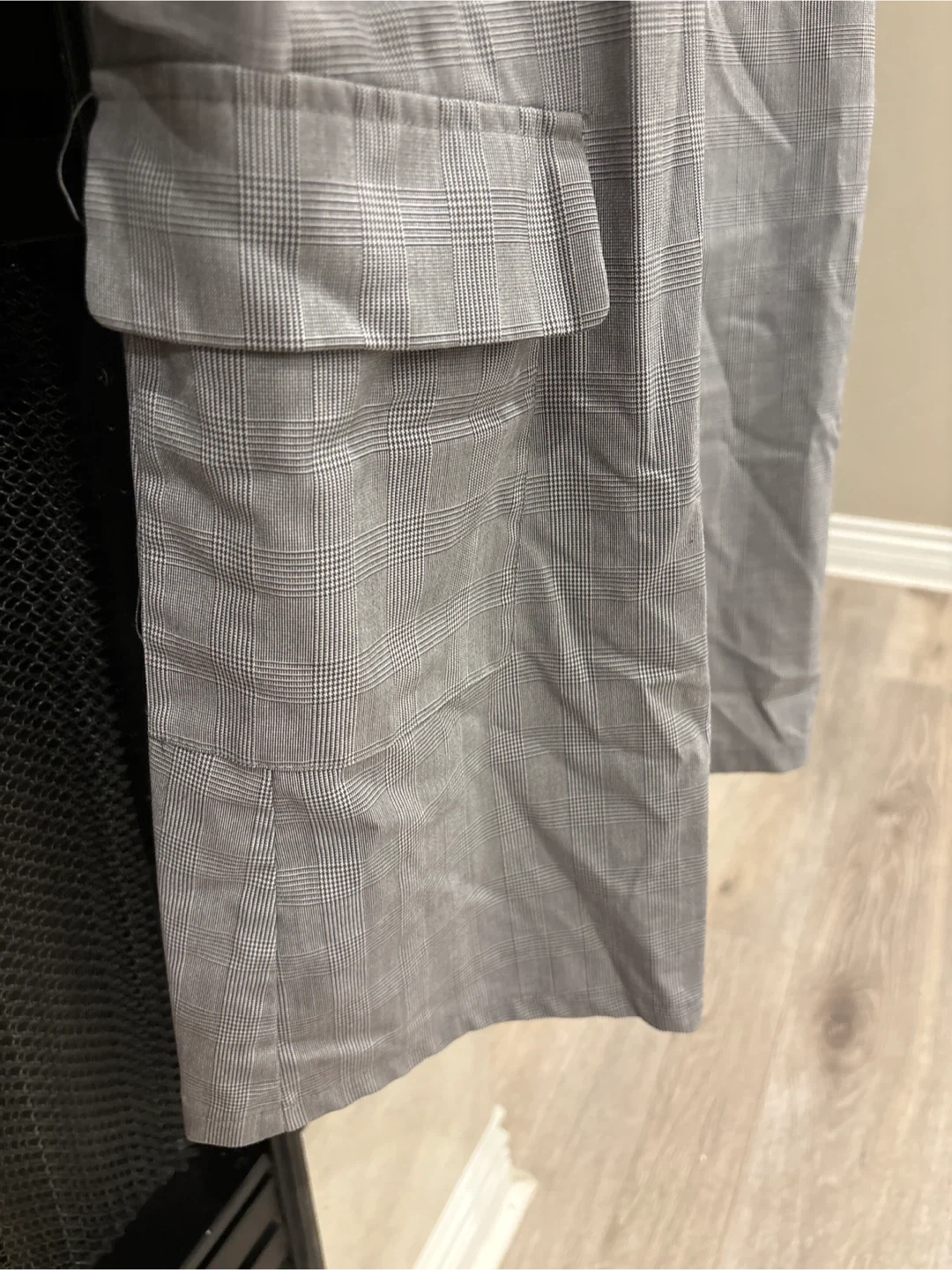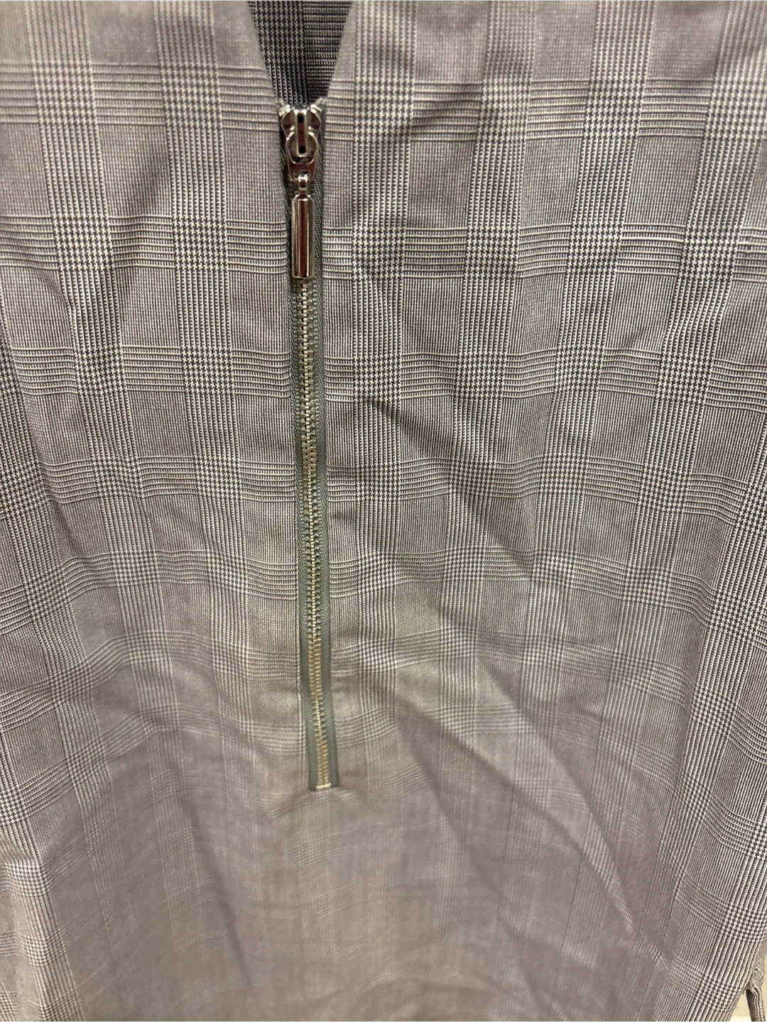 Zara dress in a grey plaid pattern. It features a V-neck and a zipper down the front. The size is M.