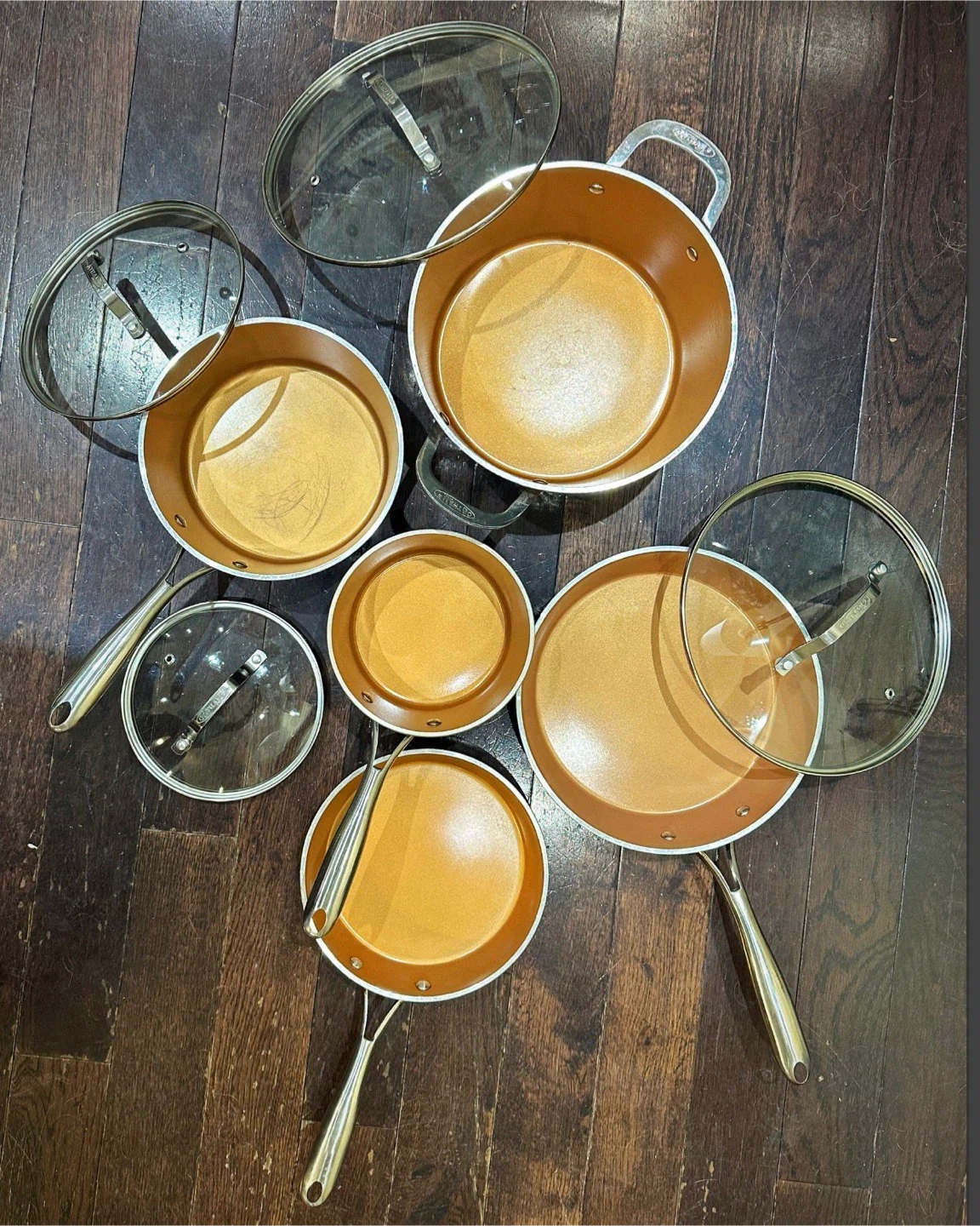 Selling a Gotham Steel Diamond Hammered Design 9 piece Non-Stick Aluminum Cookware Set. This set includes:
