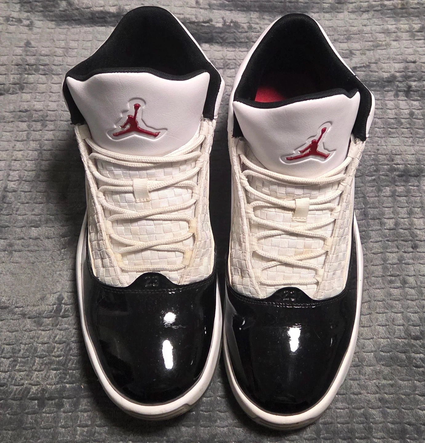 Selling a pair of Jordan Max Aura 2 sneakers in a classic white and black colourway. They are a US size 12. These are in good condition with very little wear.