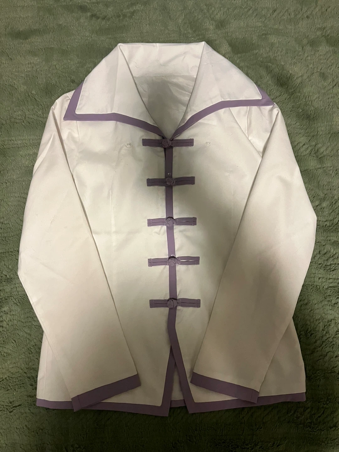 comes with a white and purple button up with white pants! Comes with his cape and detachable fur! Free hat with purchase:)