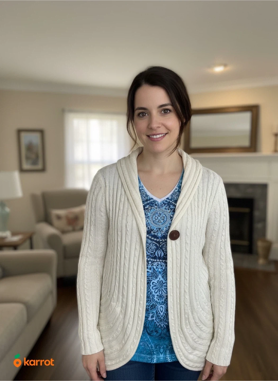 It features a button closure and a cozy, knitted design.